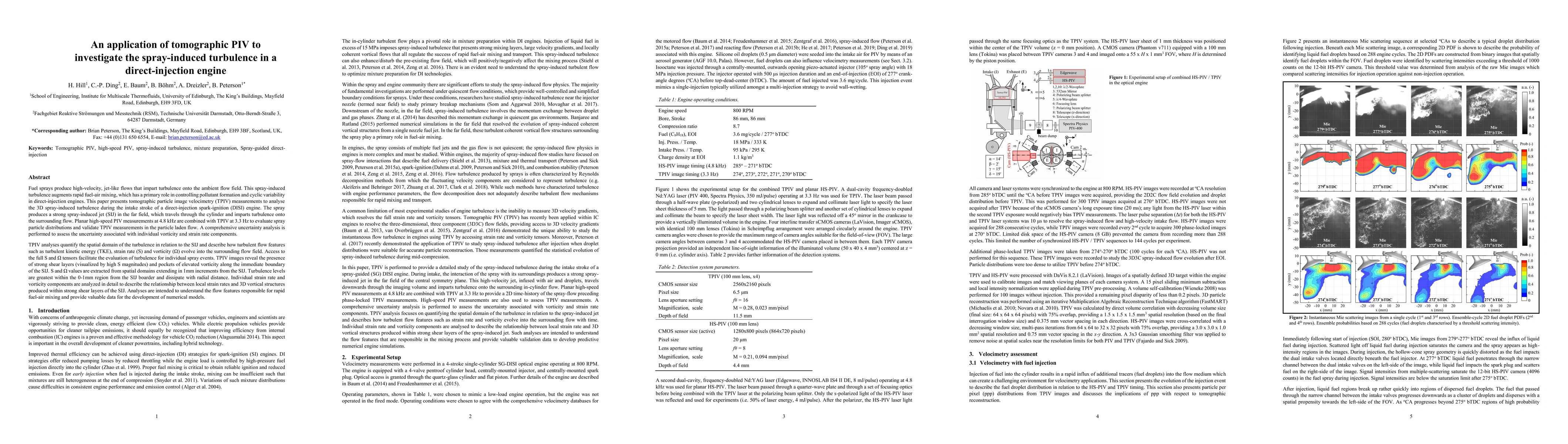 Fuel sprays produce high-velocity, jet-like flows that impart turbulence onto the ambient flow field. The spray-induced turbulence augments fuel-air mixing, which has a primary role in controlling pollutant formation and cyclic variability in engines. This paper presents tomographic particle image velocimetry (TPIV) measurements to analyse the 3D spray-induced turbulence during the intake stroke of a direct-injection engine. The spray produces a strong spray-induced jet in the far field, which travels through the cylinder and imparts turbulence onto the surrounding flow. Planar high-speed PIV measurements at 4.8 kHz are combined with TPIV at 3.3 Hz to evaluate spray particle distributions and validate TPIV measurements in the particle-laden flow. An uncertainty analysis is performed to assess the uncertainty associated with vorticity and strain rate components. TPIV analyses quantify the spatial domain of the turbulence in relation to the SIJ and describe how turbulent flow features such as turbulent kinetic energy, strain rate and vorticity evolve into the surrounding flow field. Access to the full tensors facilitate the evaluation of turbulence for individual spray events. TPIV images reveal the presence of strong shear layers (visualized by high S magnitudes) and pockets of elevated vorticity along the immediate boundary of the SIJ. Values are extracted from spatial domains extending in 1mm increments from the SIJ. Turbulence levels are greatest within the 0-1mm region from the SIJ boarder and dissipate with radial distance. Individual strain rate and vorticity components are analyzed in detail to describe the relationship between local strain rates and 3D vortical structures produced within strong shear layers of the SIJ. Analyses are intended to understand the flow features responsible for rapid fuel-air mixing and provide valuable data for the development of numerical models.