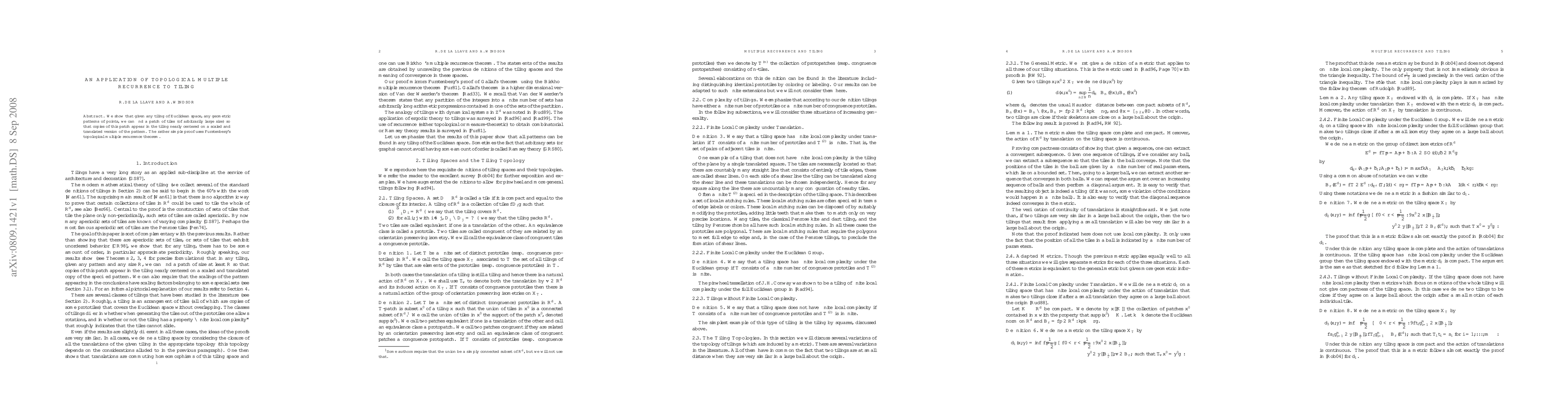 This paper applies Furstenberg's topological multiple recurrence theorem to demonstrate that any tiling of Euclidean space contains arbitrarily large patches that recur in scaled and translated versions of given geometric patterns. The proof is straightforward and leverages advanced topological concepts.