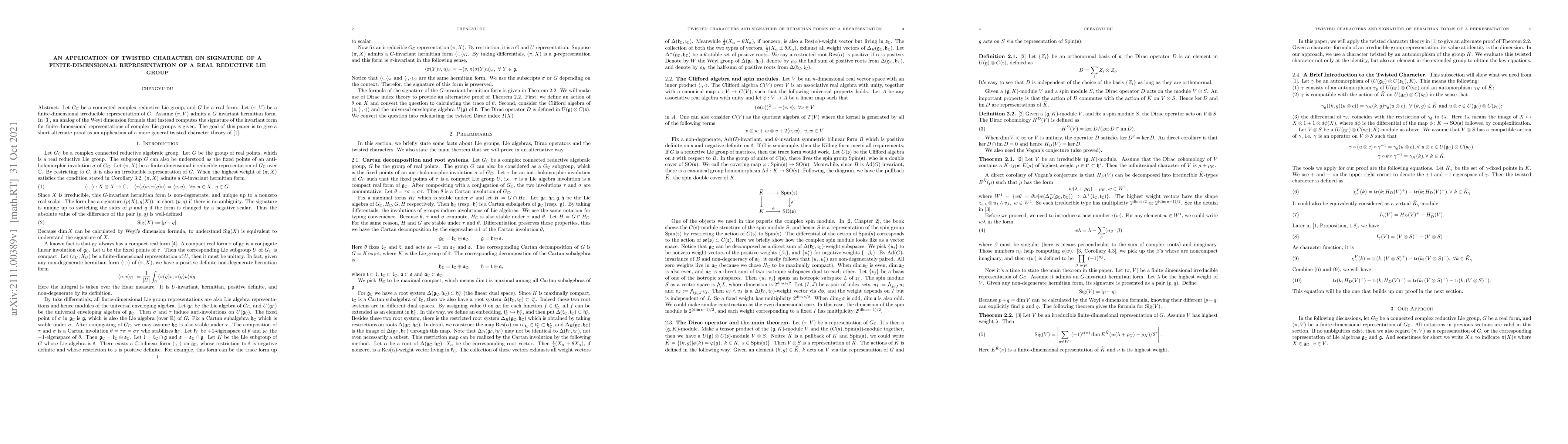 Let $G_\cpl$ be a connected complex reductive Lie group, and $G$ be a real form. Let $(\pi,V)$ be a finite-dimensional irreducible representation of $G$. Assume $(\pi,V)$ admits a $G$ invariant hermitian form. {In \cite{Signature-of-a-rep-of-reductive}, an analog of the Weyl dimension formula that instead computes the signature of the invariant form for finite dimensional representations of complex Lie groups is given. The goal of this paper is to give a short alternate proof as an application of a more general twisted character theory of \cite{Dirac-Index-and-Twisted-Characters}.