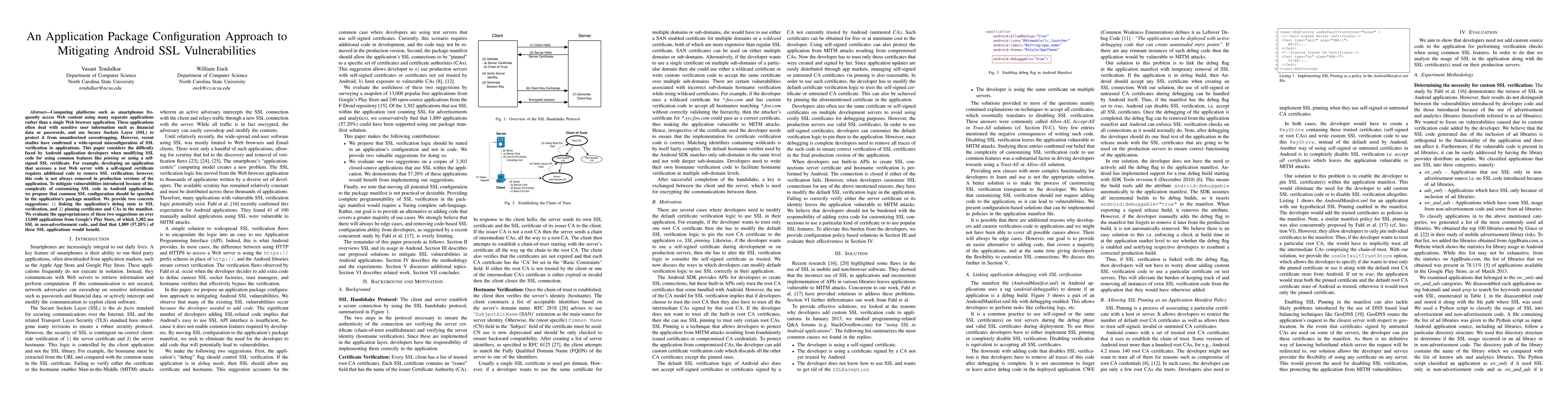 This paper proposes a method to mitigate SSL vulnerabilities in Android applications by specifying common SSL configurations in the application's package manifest. It suggests linking SSL verification to the debug state and pinning certificates and CAs, and evaluates that 57.20% of SSL-using applications on Google's Play Store would benefit from these measures.