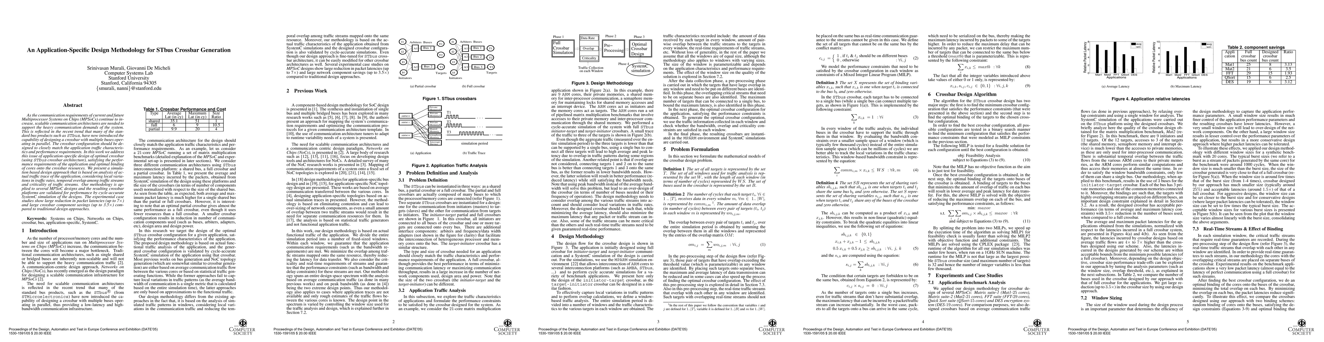 This paper introduces a simulation-based methodology for designing application-specific STbus crossbars in MPSoCs, focusing on matching traffic characteristics and performance needs. It achieves significant reductions in packet latencies and crossbar resource usage through cycle-accurate SystemC simulations of multiple MPSoC designs.