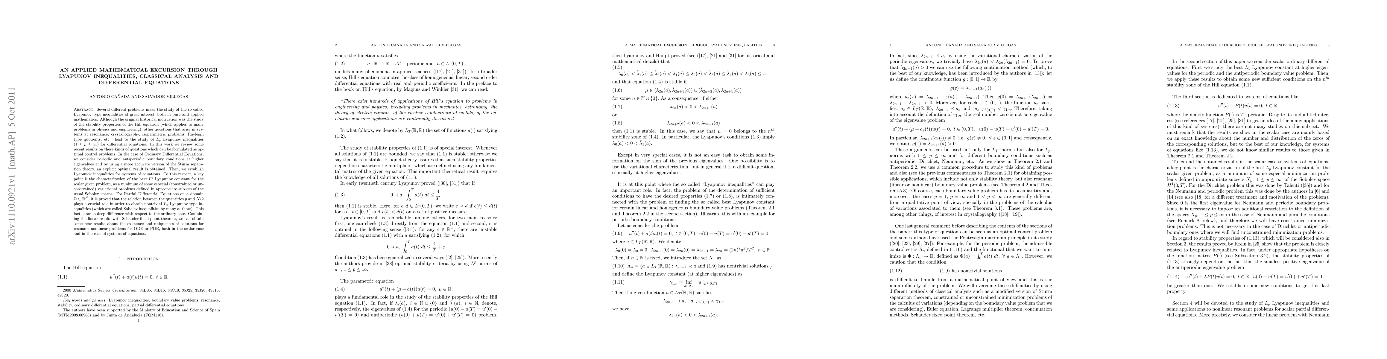 Several different problems make the study of the so called Lyapunov type inequalities of great interest, both in pure and applied mathematics. Although the original historical motivation was the study of the stability properties of the Hill equation (which applies to many problems in physics and engineering), other questions that arise in systems at resonance, crystallography, isoperimetric problems, Rayleigh type quotients, etc. lead to the study of $L_p$ Lyapunov inequalities ($1\leq p\leq \infty$) for differential equations. In this work we review some recent results on these kinds of questions which can be formulated as optimal control problems. In the case of Ordinary Differential Equations, we consider periodic and antiperiodic boundary conditions at higher eigenvalues and by using a more accurate version of the Sturm separation theory, an explicit optimal result is obtained. Then, we establish Lyapunov inequalities for systems of equations. To this respect, a key point is the characterization of the best $L^p$ Lyapunov constant for the scalar given problem, as a minimum of some especial (constrained or unconstrained) variational problems defined in appropriate subsets of the usual Sobolev spaces. For Partial Differential Equations on a domain $\Omega \subset \real^N$, it is proved that the relation between the quantities $p$ and $N/2$ plays a crucial role in order to obtain nontrivial $L_p$ Lyapunov type inequalities (which are called Sobolev inequalities by many authors). This fact shows a deep difference with respect to the ordinary case. Combining the linear results with Schauder fixed point theorem, we can obtain some new results about the existence and uniqueness of solutions for resonant nonlinear problems for ODE or PDE, both in the scalar case and in the case of systems of equations