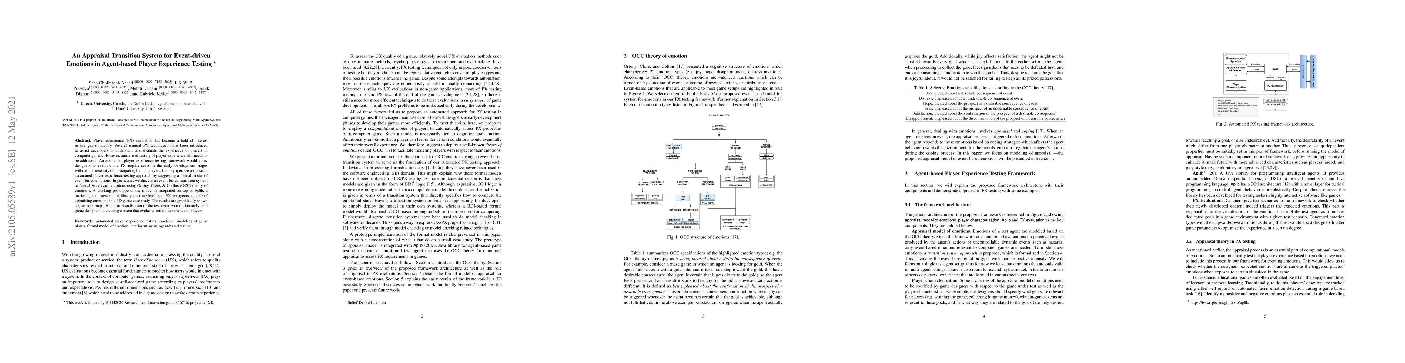 This paper proposes an automated player experience testing framework using an event-driven transition system based on OCC theory to model player emotions. A prototype integrated with Aplib creates intelligent test agents that visualize emotions in 3D games, aiding designers in crafting emotionally engaging content.