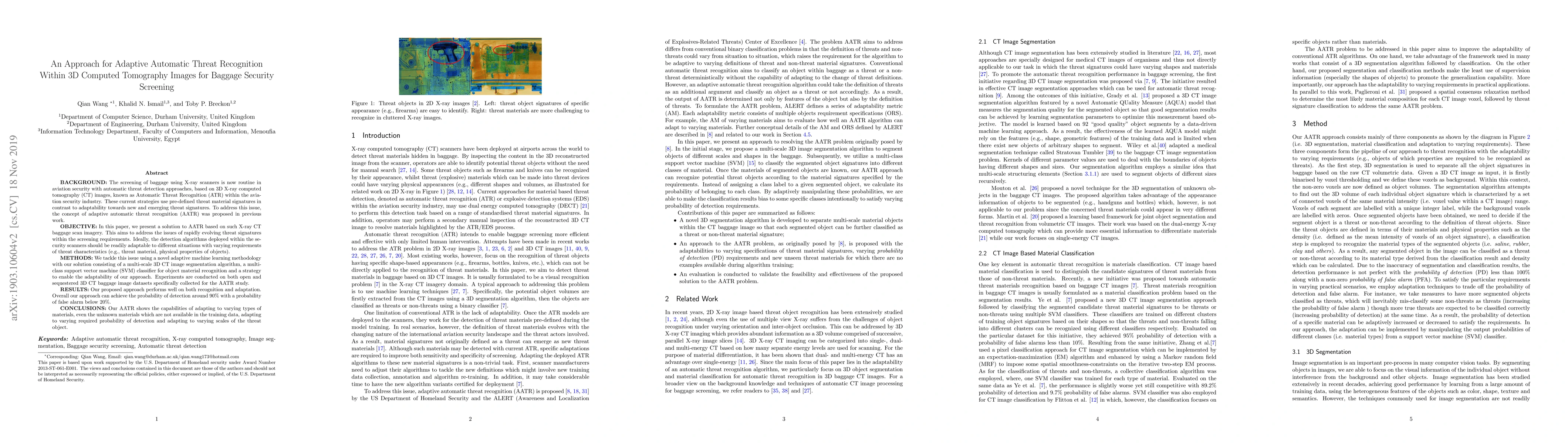 This paper proposes an adaptive automatic threat recognition (AATR) system for 3D CT baggage scans to detect evolving threat signatures in aviation security. The solution employs a multi-scale segmentation algorithm, a multi-class SVM classifier, and an adaptive machine learning methodology to achieve high detection rates and adaptability to new and unknown threat materials, with a detection probability of around 90% and a false alarm rate below 20%.