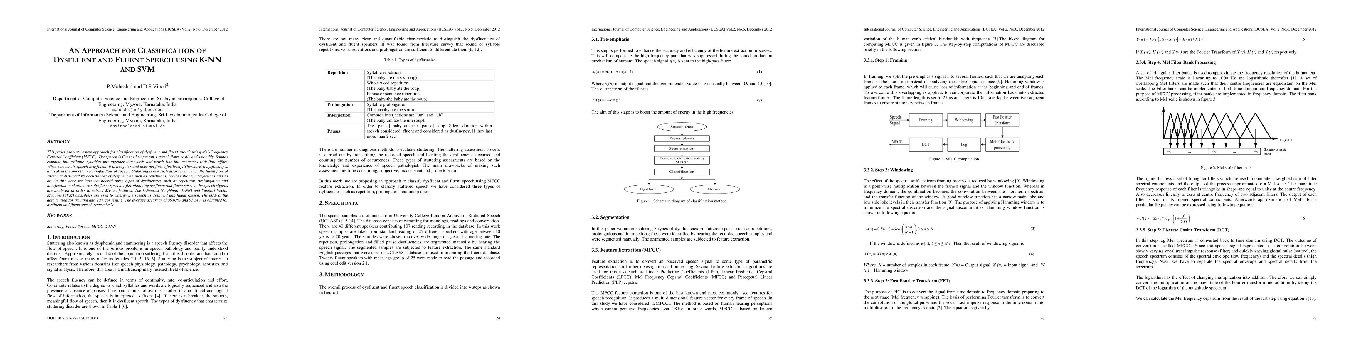 This paper proposes a method for classifying dysfluent and fluent speech using Mel-Frequency Cepstral Coefficients (MFCC) and employs k-Nearest Neighbor (k-NN) and Support Vector Machine (SVM) classifiers, achieving an average accuracy of 86.67% for dysfluent and 93.34% for fluent speech.