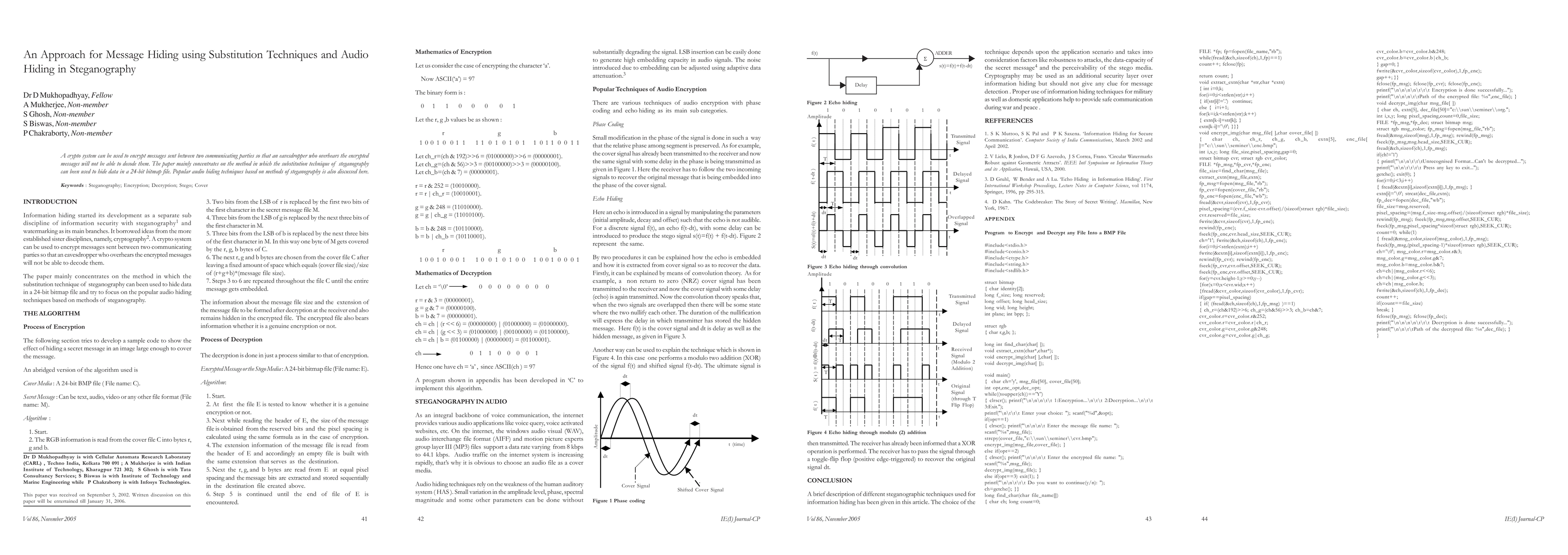 This paper explores a cryptosystem for message encryption using steganography, combining substitution techniques to hide data within 24-bit bitmap files and discussing popular audio hiding methods for enhanced data security.