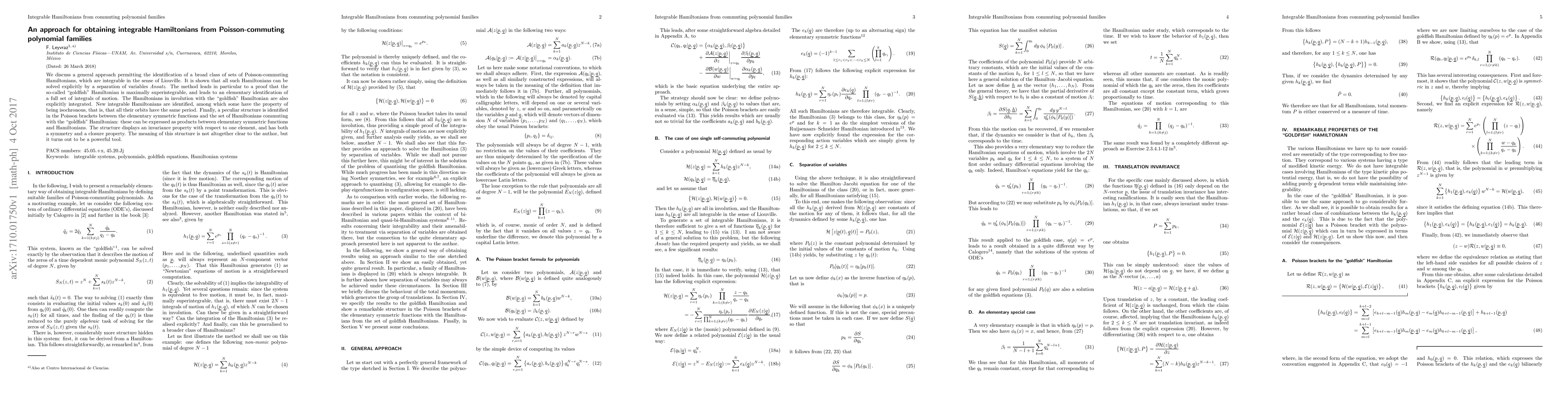 We discuss a general approach permitting the identification of a broad class of sets of Poisson-commuting Hamiltonians, which are integrable in the sense of Liouville. It is shown that all such Hamiltonians can be solved explicitly by a separation of variables {\em Ansatz}. The method leads in particular to a proof that the so-called "goldfish" Hamiltonian is maximally superintegrable, and leads to an elementary identification of a full set of integrals of motion. The Hamiltonians in involution with the "goldfish" Hamiltonian are also explicitly integrated. New integrable Hamiltonians are identified, among which some have the property of being isochronous, that is, that all their orbits have the same period. Finally, a peculiar structure is identified in the Poisson brackets between the elementary symmetric functions and the set of Hamiltonians commuting with the "goldfish" Hamiltonian: these can be expressed as products between elementary symmetric functions and Hamiltonians. The structure displays an invariance property with respect to one element, and has both a symmetry and a closure property. The meaning of this structure is not altogether clear to the author, but it turns out to be a powerful tool.