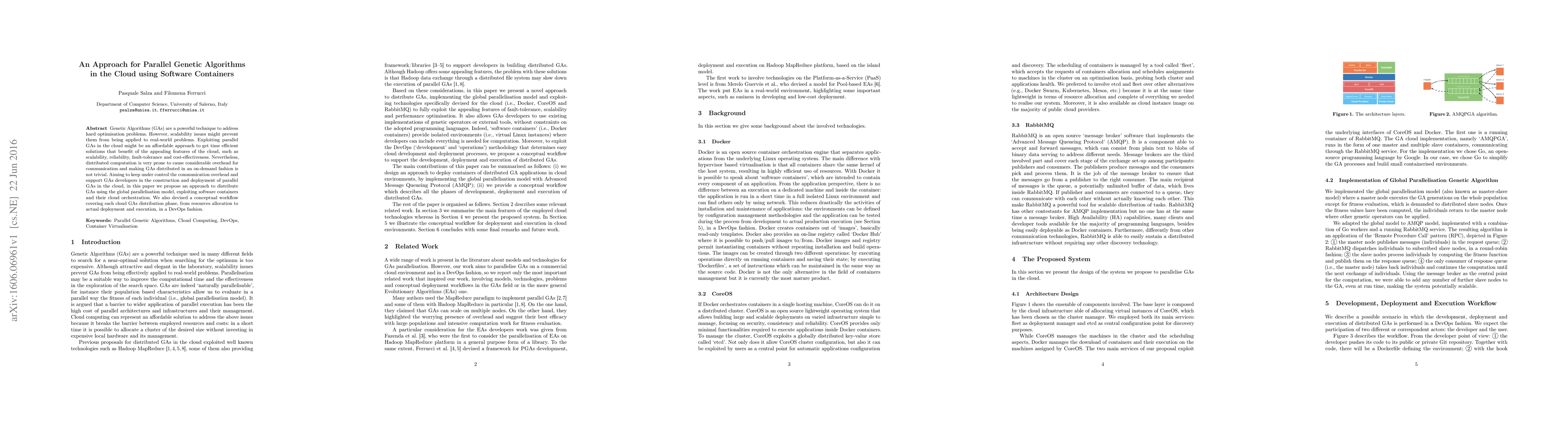 This paper proposes a method to distribute Genetic Algorithms in the cloud using software containers, aiming to minimize communication overhead and support easy deployment and execution. It outlines a conceptual workflow for allocating resources, deploying, and executing parallel GAs in the cloud.