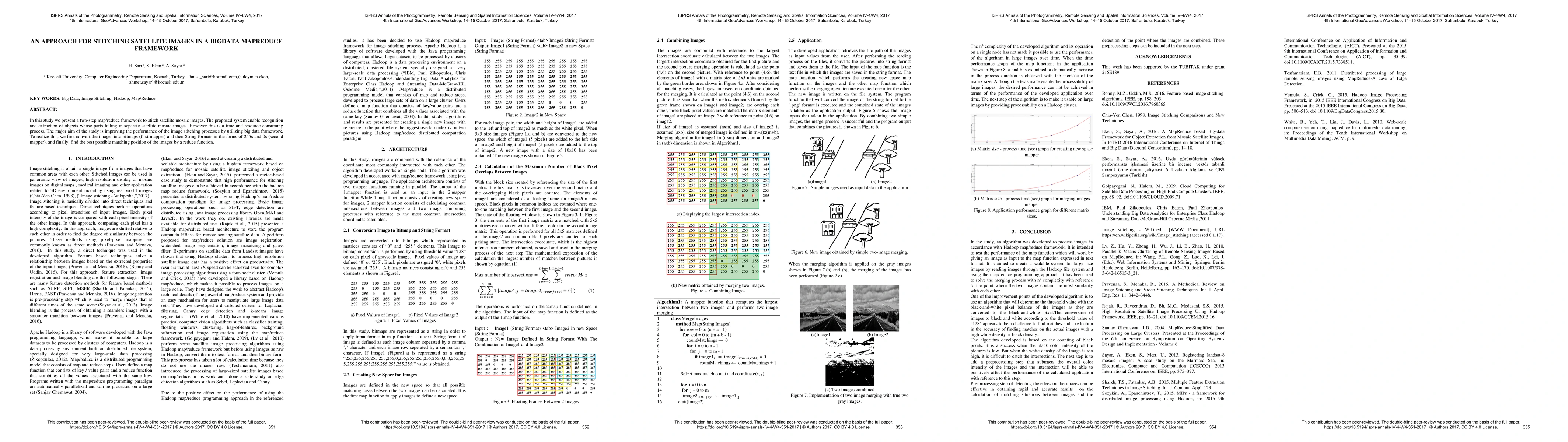 In this study we present a two-step map/reduce framework to stitch satellite mosaic images. The proposed system enable recognition and extraction of objects whose parts falling in separate satellite mosaic images. However this is a time and resource consuming process. The major aim of the study is improving the performance of the image stitching processes by utilizing big data framework. To realize this, we first convert the images into bitmaps (first mapper) and then String formats in the forms of 255s and 0s (second mapper), and finally, find the best possible matching position of the images by a reduce function.