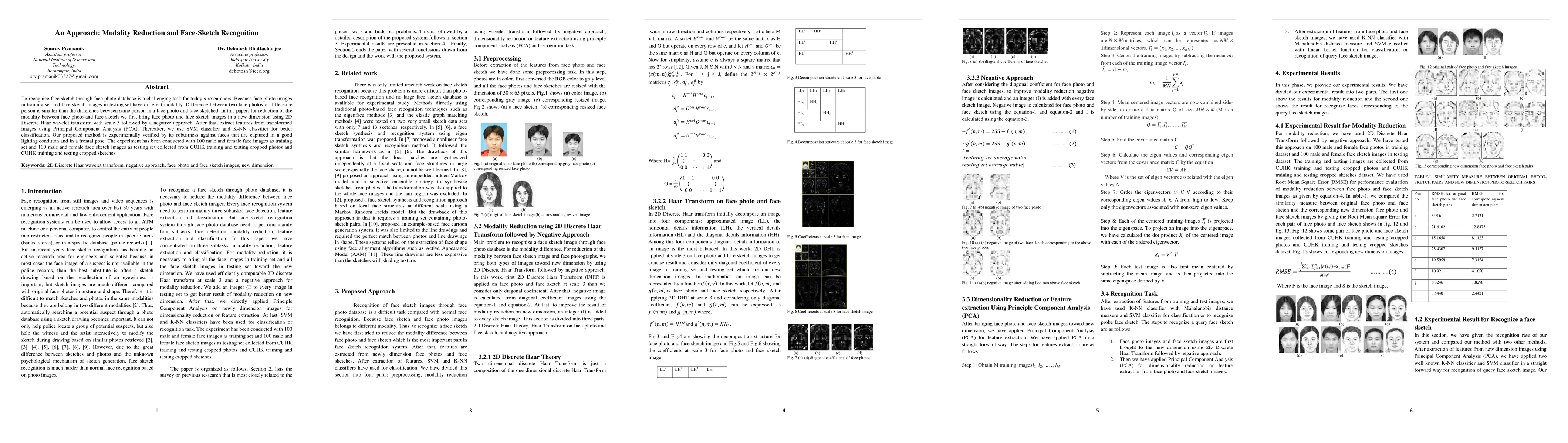 This paper proposes a method for recognizing face sketches from face photo databases by reducing modality differences using 2D Discrete Haar wavelet transform and PCA feature extraction, followed by SVM and K-NN classification. The approach is tested on 100 training and 100 testing images, demonstrating robustness under good lighting and frontal poses.