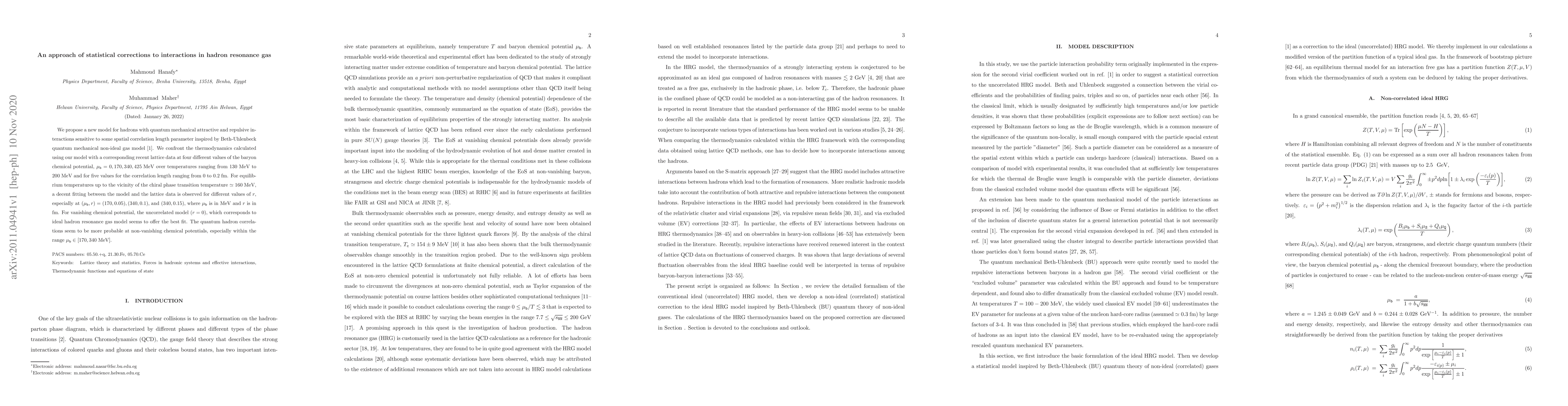 We propose a new model for hadrons with quantum mechanical attractive and repulsive interactions sensitive to some spatial correlation length parameter inspired by Beth-Uhlenbeck quantum mechanical non-ideal gas model \cite{uhlenbeck1937quantum}. We confront the thermodynamics calculated using our model with a corresponding recent lattice data at four different values of the baryon chemical potential, $\mu_{\mathtt{b}}= 0, 170, 340, 425~$MeV over temperatures ranging from $130$ MeV to $200~$MeV and for five values for the correlation length ranging from $0$ to $0.2~$fm. For equilibrium temperatures up to the vicinity of the chiral phase transition temperature $\simeq 160~$MeV, a decent fitting between the model and the lattice data is observed for different values of $r$, especially at $(\mu_{\mathtt{b}}, r) = (170,0.05), (340,0.1)$, and $(340,0.15)$, where $\mu_{\mathtt{b}}$ is in MeV and $r$ is in fm. For vanishing chemical potential, the uncorrelated model ($r=0$), which corresponds to ideal hadron resonance gas model seems to offer the best fit. The quantum hadron correlations seem to be more probable at non-vanishing chemical potentials, especially within the range $\mu_{\mathtt{b}}\in [170, 340~$MeV$]$.
