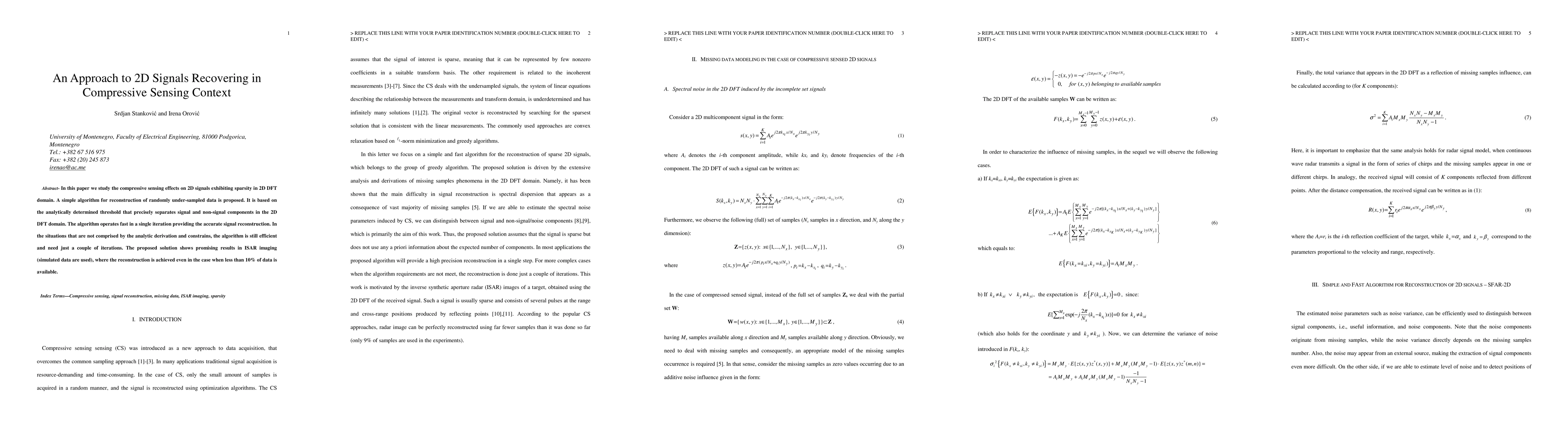 A new algorithm recovers 2D signals with sparsity in a compressed sensing context by using an analytically determined threshold to separate signal from non-signal components, achieving accurate reconstruction in single iterations.