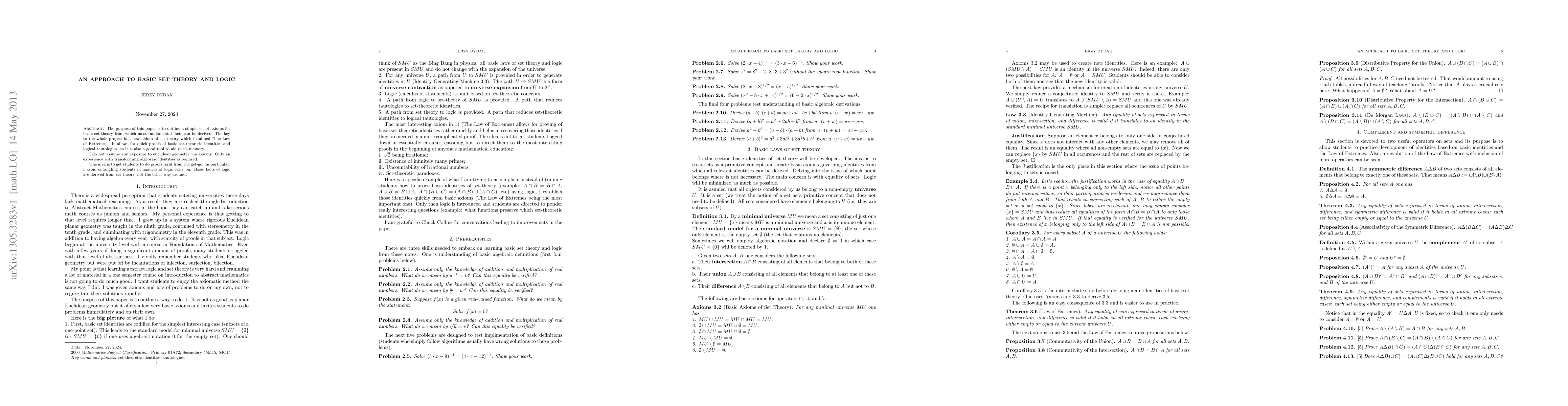 The purpose of this paper is to outline a simple set of axioms for basic set theory from which most fundamental facts can be derived. The key to the whole project is a new axiom of set theory which I dubbed "The Law of Extremes". It allows for quick proofs of basic set-theoretic identities and logical tautologies, so it is also a good tool to aid one's memory. I do not assume any exposure to euclidean geometry via axioms. Only an experience with transforming algebraic identities is required. The idea is to get students to do proofs right from the get-go. In particular, I avoid entangling students in nuances of logic early on. Basic facts of logic are derived from set theory, not the other way around.
