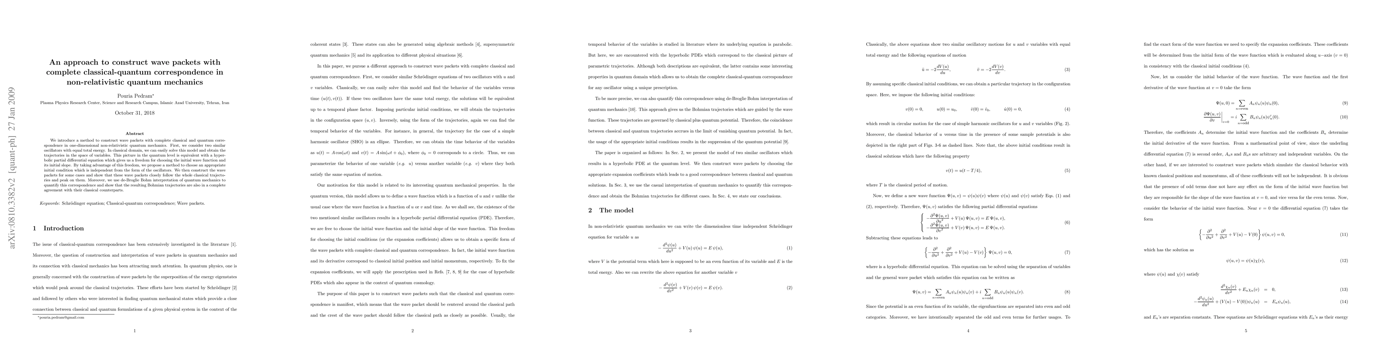 We introduce a method to construct wave packets with complete classical and quantum correspondence in one-dimensional non-relativistic quantum mechanics. First, we consider two similar oscillators with equal total energy. In classical domain, we can easily solve this model and obtain the trajectories in the space of variables. This picture in the quantum level is equivalent with a hyperbolic partial differential equation which gives us a freedom for choosing the initial wave function and its initial slope. By taking advantage of this freedom, we propose a method to choose an appropriate initial condition which is independent from the form of the oscillators. We then construct the wave packets for some cases and show that these wave packets closely follow the whole classical trajectories and peak on them. Moreover, we use de-Broglie Bohm interpretation of quantum mechanics to quantify this correspondence and show that the resulting Bohmian trajectories are also in a complete agreement with their classical counterparts.