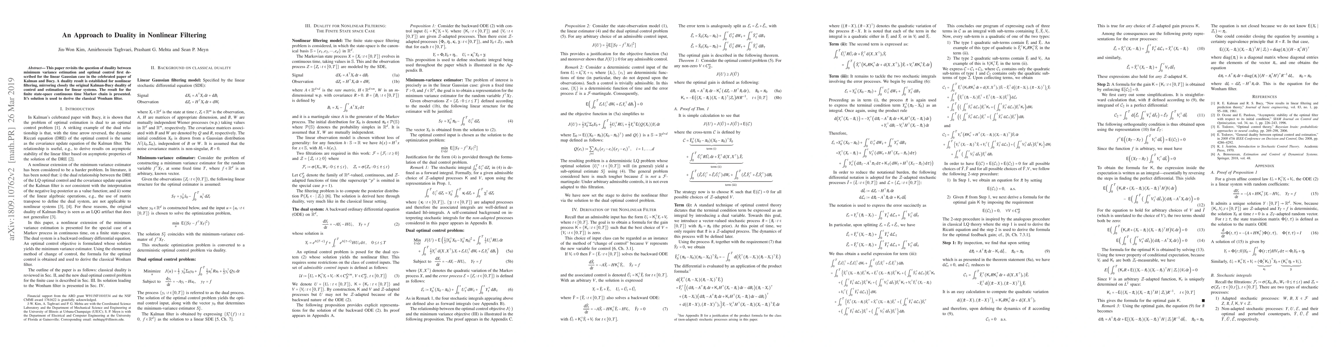 This paper establishes a duality result for nonlinear filtering, mirroring the original Kalman-Bucy duality between control and estimation in linear systems, and provides a solution to derive the classical Wonham filter.