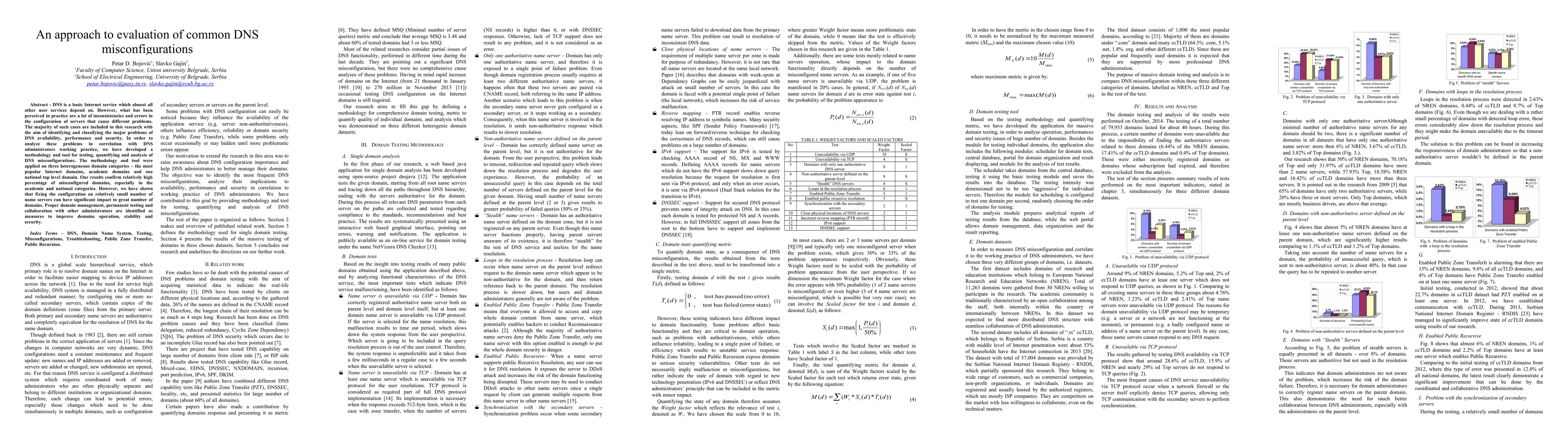 DNS is a basic Internet service which almost all other user services depend on. However, what has been perceived in practice are a lot of inconsistencies and errors in the configuration of servers that cause different problems. The majority of such cases are included in this research with the aim of identifying and classifying the major problems of DNS availability, performance and security. In order to analyze these problems in correlation with DNS administrators working practice, we have developed a methodology and tool for testing, quantifying and analysis of DNS misconfigurations. The methodology and tool were applied on three heterogeneous domain categories - the most popular Internet domains, academic domains and one national top level domain. Our results confirm relatively high percentage of misconfigured domains, especially in the academic and national categories. However, we have shown that fixing the configuration on relatively small number of name servers can have significant impact to great number of domains. Proper domain management, permanent testing and collaboration with other administrators are identified as measures to improve domains operation, stability and security.