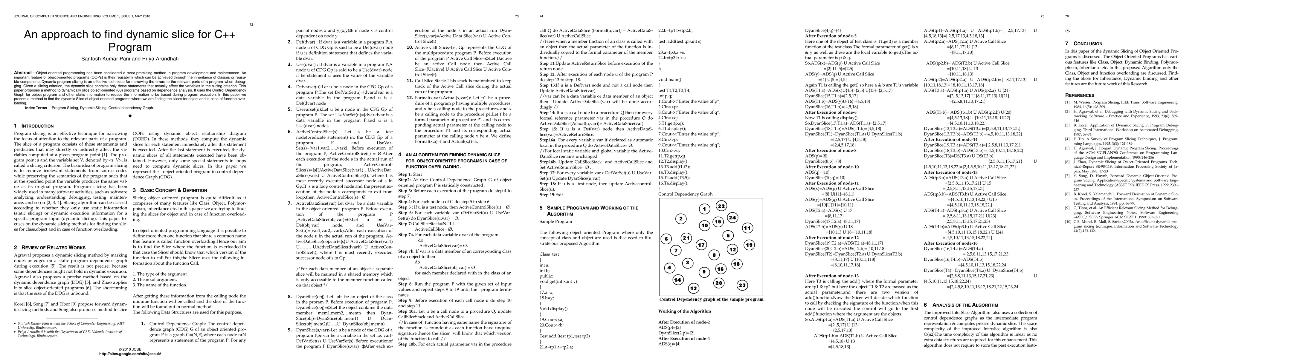 This paper proposes a method for dynamically slicing object-oriented C++ programs using dependence analysis and Control Dependency Graphs to identify relevant statements affecting specified variables, thereby aiding in debugging by isolating error-related code. The approach also addresses dynamic slicing in cases of function overloading.