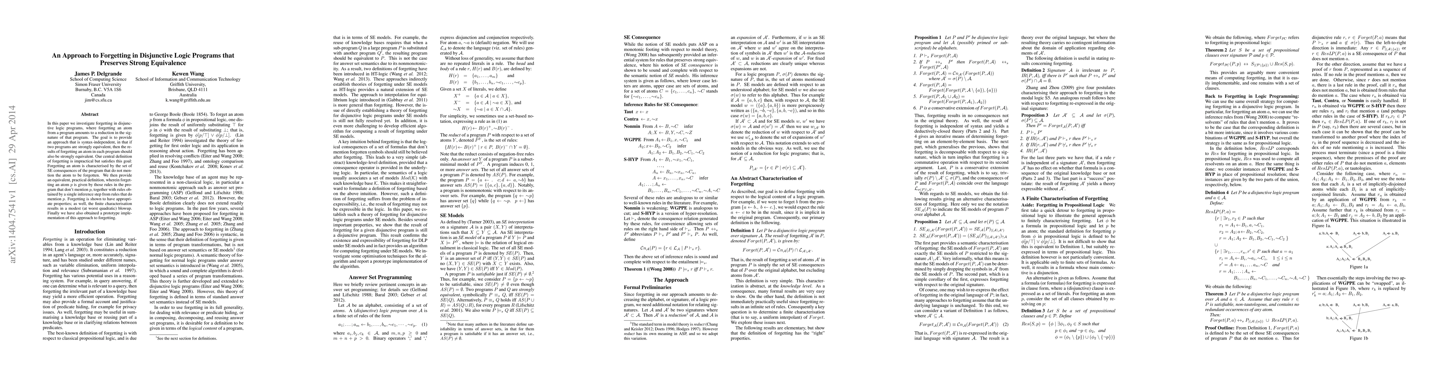 The paper investigates forgetting in disjunctive logic programs, defining forgetting syntactically-independently such that if two programs are strongly equivalent, forgetting an atom in each should yield strongly equivalent results. It introduces a central definition of forgetting based on SE consequences and a practical definition using rules that can be derived in one inference step.
