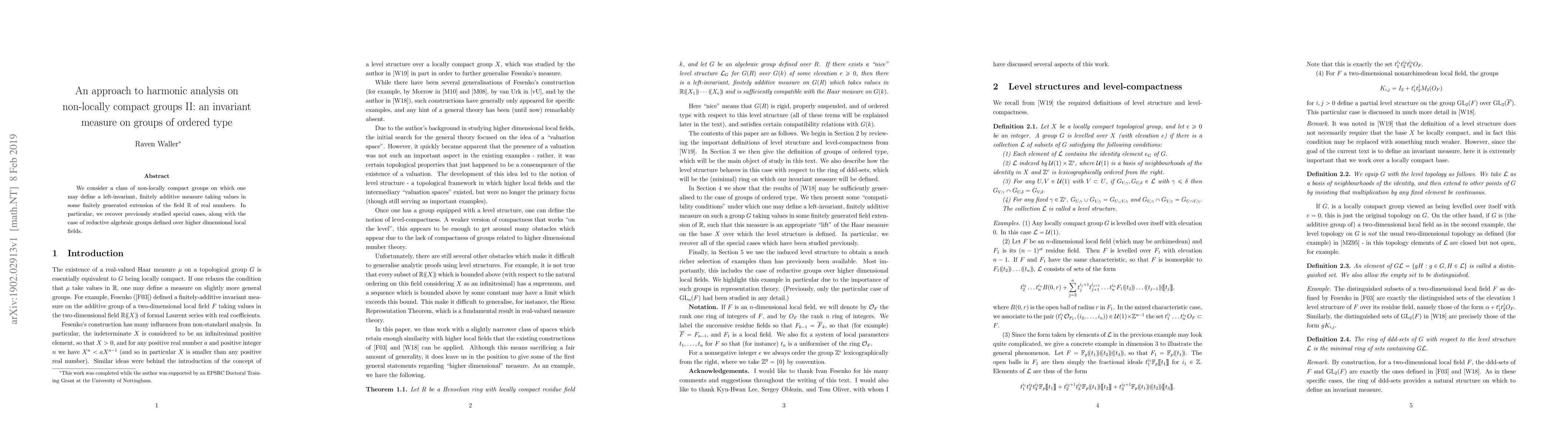 We consider a class of non-locally compact groups on which one may define a left-invariant, finitely additive measure taking values in some finitely generated extension of the field $\mathbb{R}$ of real numbers. In particular, we recover previously studied special cases, along with the case of reductive algebraic groups defined over higher dimensional local fields.