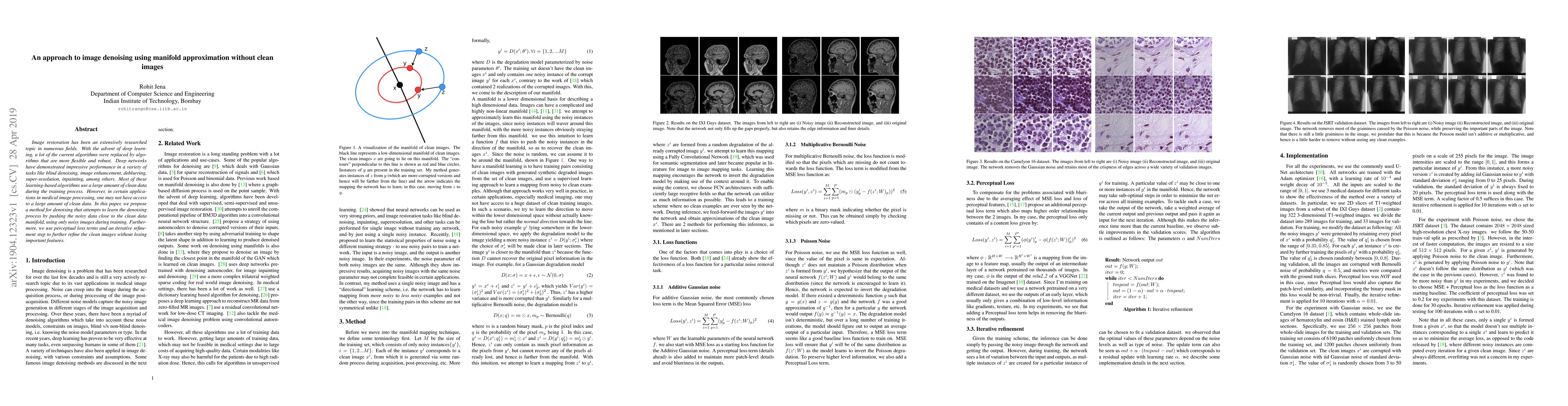 This paper proposes a novel image denoising method that leverages the clean data manifold approximation without requiring clean training images, employing perceptual loss and iterative refinement to enhance denoised outputs, especially useful in medical imaging where clean data is scarce.