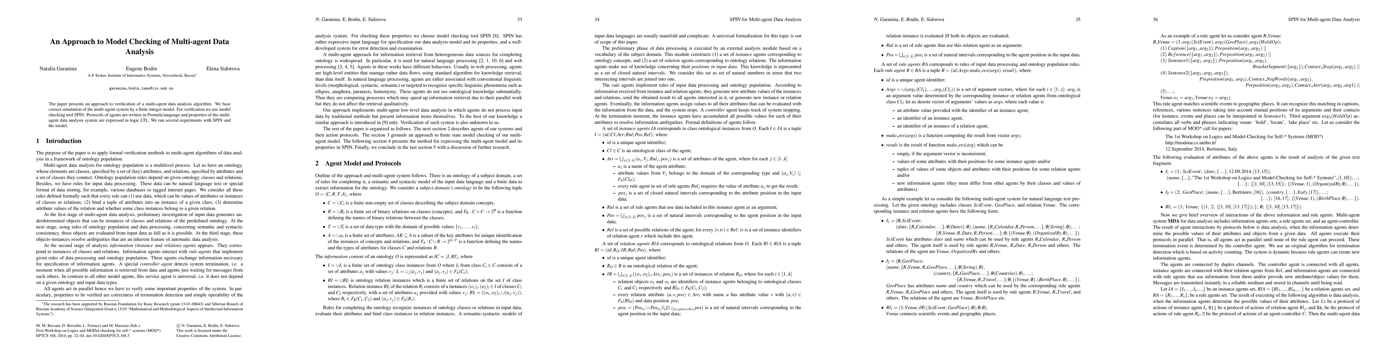 The paper presents an approach to verification of a multi-agent data analysis algorithm using model checking with SPIN, where protocols of agents are written in Promela language and properties are expressed in LTL.