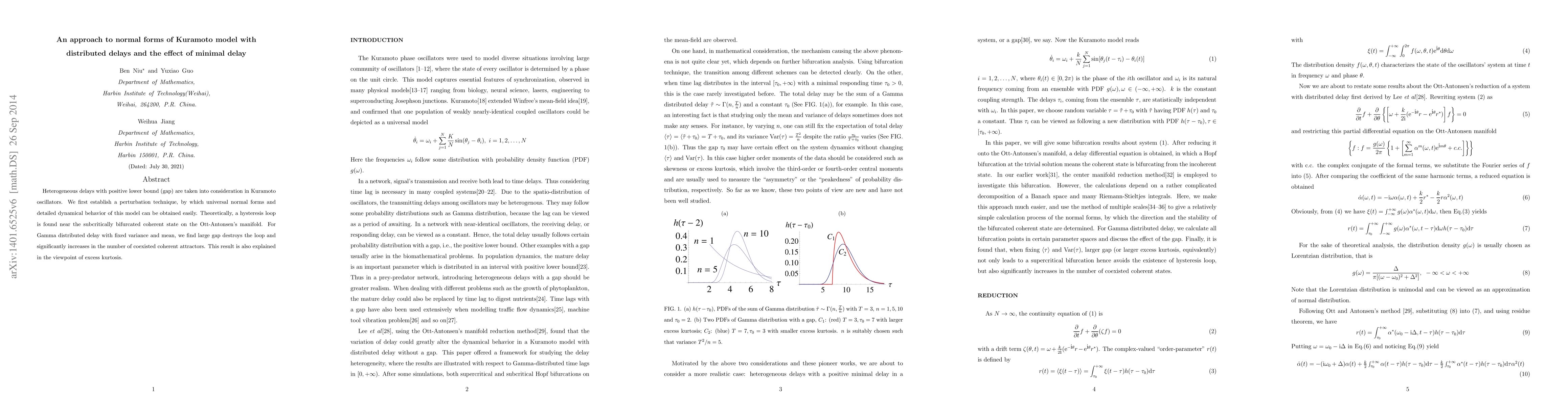 Heterogeneous delays with positive lower bound (gap) are taken into consideration in Kuramoto oscillators. We first establish a perturbation technique, by which universal normal forms and detailed dynamical behavior of this model can be obtained easily. Theoretically, a hysteresis loop is found near the subcritically bifurcated coherent state on the Ott-Antonsen's manifold. For Gamma distributed delay with fixed variance and mean, we find large gap destroys the loop and significantly increases in the number of coexisted coherent attractors. This result is also explained in the viewpoint of excess kurtosis.