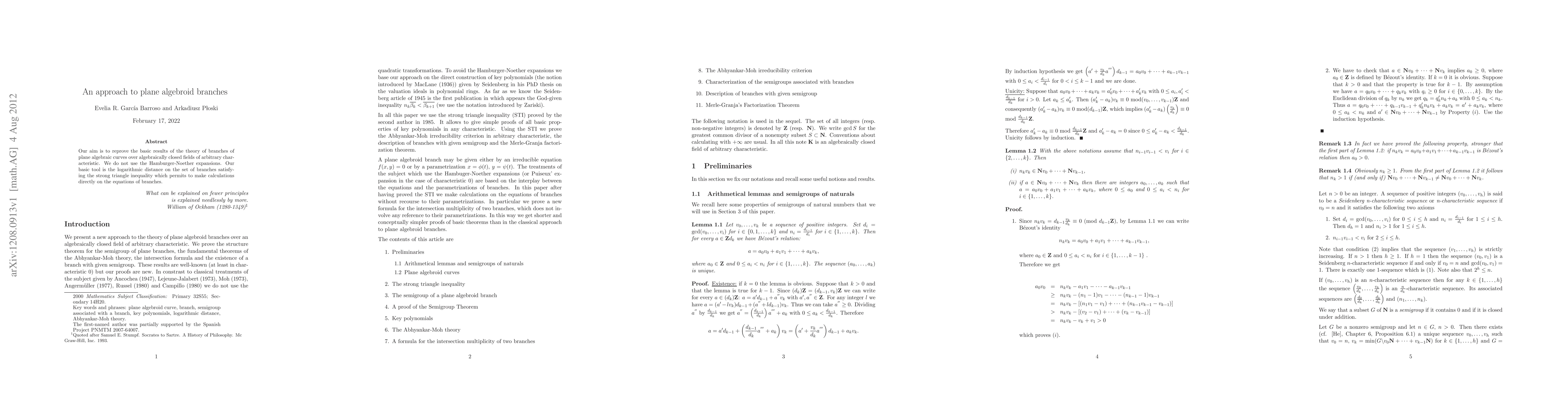 Our aim is to reprove the basic results of the theory of branches of plane algebraic curves over algebraically closed fields of arbitrary characteristic. We do not use the Hamburger-Noether expansions. Our basic tool is the logarithmic distance on the set of branches satisfying the strong triangle inequality which permits to make calculations directly on the equations of branches.