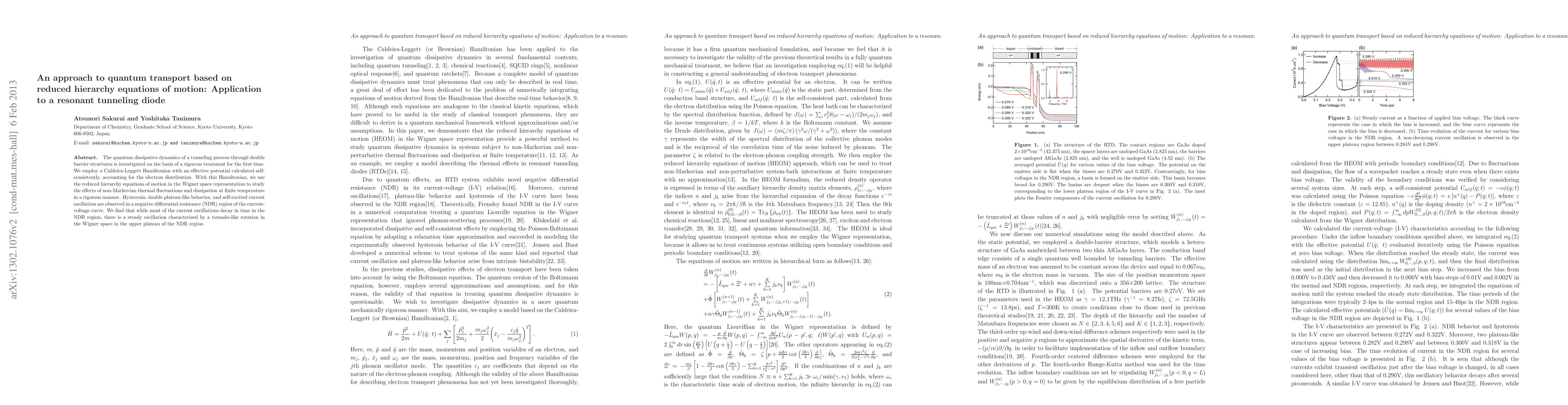 The quantum dissipative dynamics of a tunneling process through double barrier structures is investigated on the basis of a rigorous treatment for the first time. We employ a Caldeira-Leggett Hamiltonian with an effective potential calculated self-consistently, accounting for the electron distribution. With this Hamiltonian, we use the reduced hierarchy equations of motion in the Wigner space representation to study the effects of non-Markovian thermal fluctuations and dissipation at finite temperature in a rigorous manner. Hysteresis, double plateau-like behavior, and self-excited current oscillation are observed in a negative differential resistance (NDR) region of the current-voltage curve. We find that while most of the current oscillations decay in time in the NDR region, there is a steady oscillation characterized by a tornado-like rotation in the Wigner space in the upper plateau of the NDR region.
