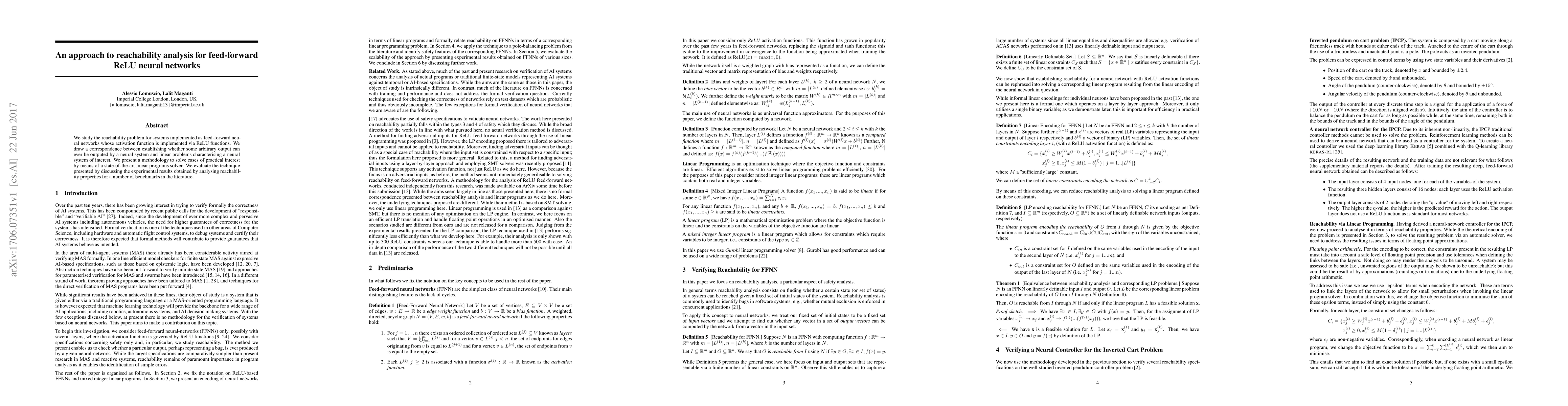 This paper proposes a method for reachability analysis in feed-forward ReLU neural networks by translating the problem into a set of linear programs, which are then solved using advanced solvers. Experimental results demonstrate the effectiveness of the approach on various benchmark neural networks.