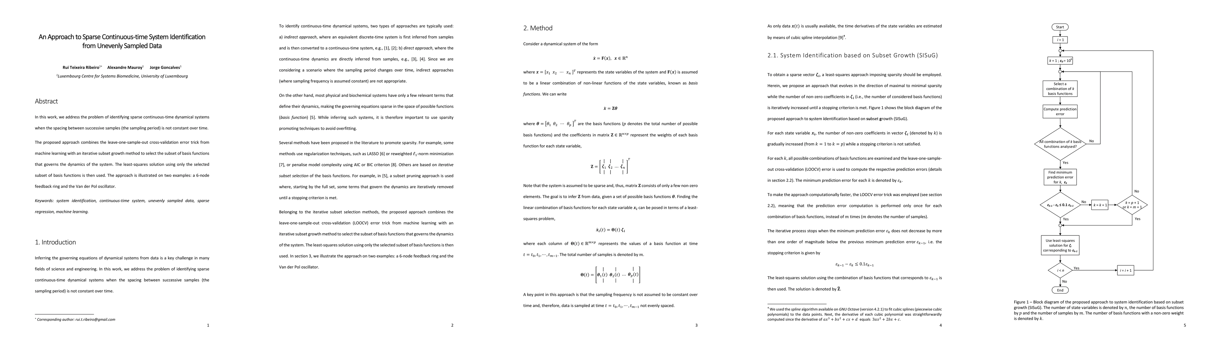 In this work, we address the problem of identifying sparse continuous-time dynamical systems when the spacing between successive samples (the sampling period) is not constant over time. The proposed approach combines the leave-one-sample-out cross-validation error trick from machine learning with an iterative subset growth method to select the subset of basis functions that governs the dynamics of the system. The least-squares solution using only the selected subset of basis functions is then used. The approach is illustrated on two examples: a 6-node feedback ring and the Van der Pol oscillator.