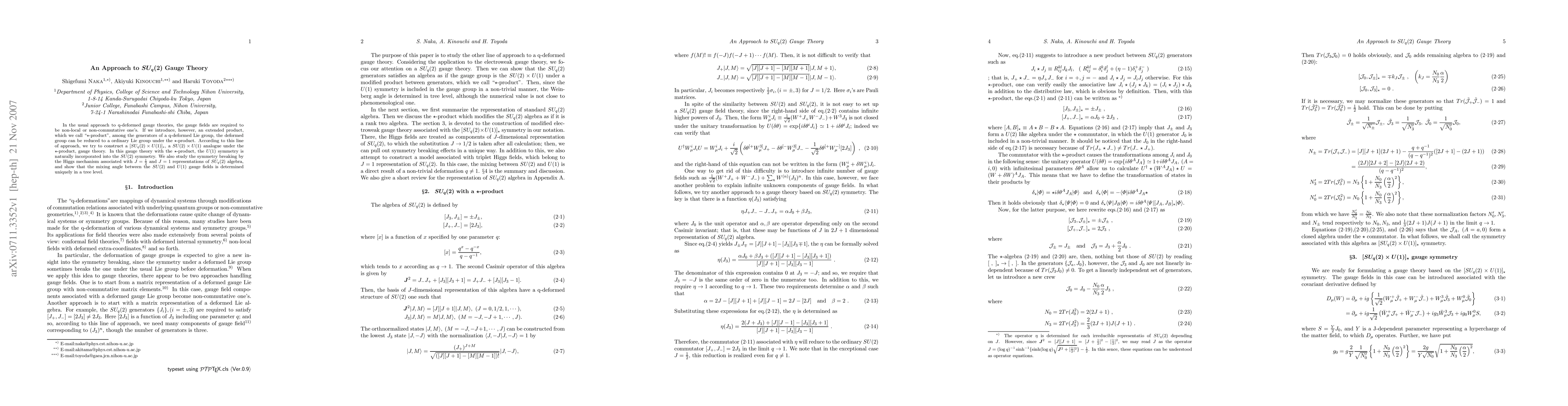 In the usual approach to q-deformed gauge theories, the gauge fields are required to be non-local or non-commutative one's. If we introduce, however, an extended product, which we call `` $\star$-product\rq\rq, among the generators of a q-deformed Lie group, the deformed group can be reduced to a ordinary Lie group under the $\star$-product. According to this line of approach, we try to construct a $[SU_q(2)\times U(1)]_\star$, a $SU(2)\times U(1)$ analogue under the $\star$-product, gauge theory. In this gauge theory with the $\star$-product, the U(1) symmetry is naturally incorporated into the SU(2) symmetry. We also study the symmetry breaking by the Higgs mechanism associated with $J=1/2$ and J=1 representations of $SU_q(2)$ algebra, and show that the mixing angle between the SU(2) and U(1) gauge fields is determined uniquely in a tree level.