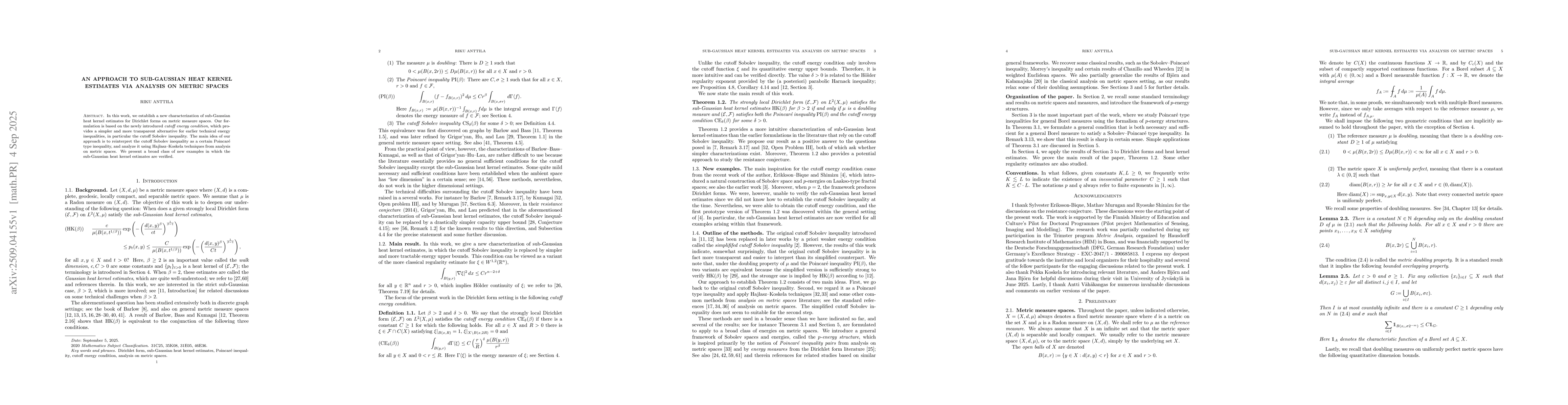 In this work, we establish a new characterization of sub-Gaussian heat kernel estimates for Dirichlet forms on metric measure spaces. Our formulation is based on the newly introduced \emph{cutoff energy condition}, which provides a simpler and more transparent alternative for earlier technical energy inequalities, in particular the cutoff Sobolev inequality. The main idea of our approach is to reinterpret the cutoff Sobolev inequality as a certain Poincar\'e type inequality, and analyze it using Haj{\l}asz--Koskela techniques from analysis on metric spaces. We present a broad class of new examples in which the sub-Gaussian heat kernel estimates are verified.