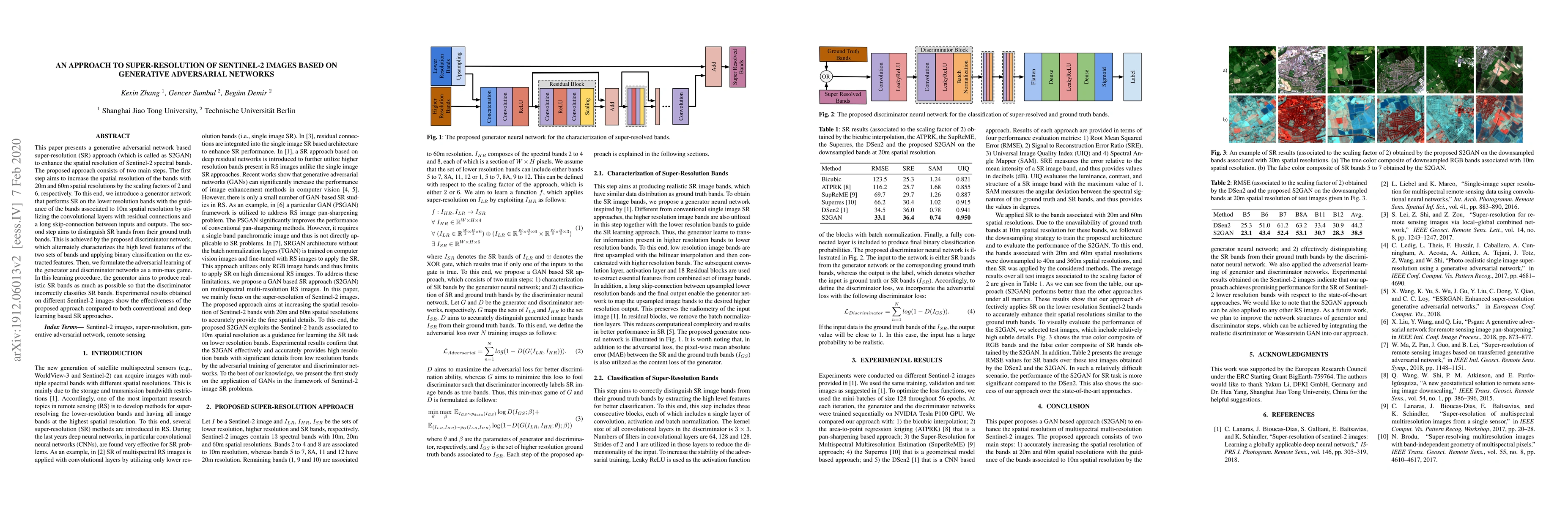 This paper introduces S2GAN, a generative adversarial network for enhancing the spatial resolution of Sentinel-2 images, achieving scaling factors of 2 and 6 for 20m and 60m bands, respectively. The approach uses a generator with residual connections and a discriminator to distinguish enhanced bands from originals, demonstrating superior performance over conventional methods.