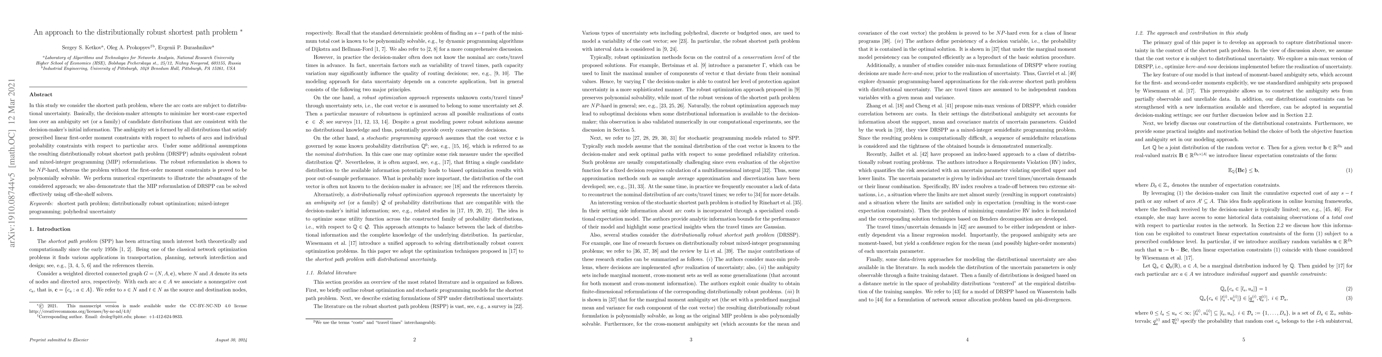 This paper addresses the distributionally robust shortest path problem, where arc costs are uncertain. It proposes a method to minimize the worst-case expected loss under an ambiguity set of candidate distributions, reformulating the problem into robust and mixed-integer programming forms. The study demonstrates the $NP$-hardness of the robust reformulation and the polynomial solvability of a simpler version, and shows numerical effectiveness using standard solvers.