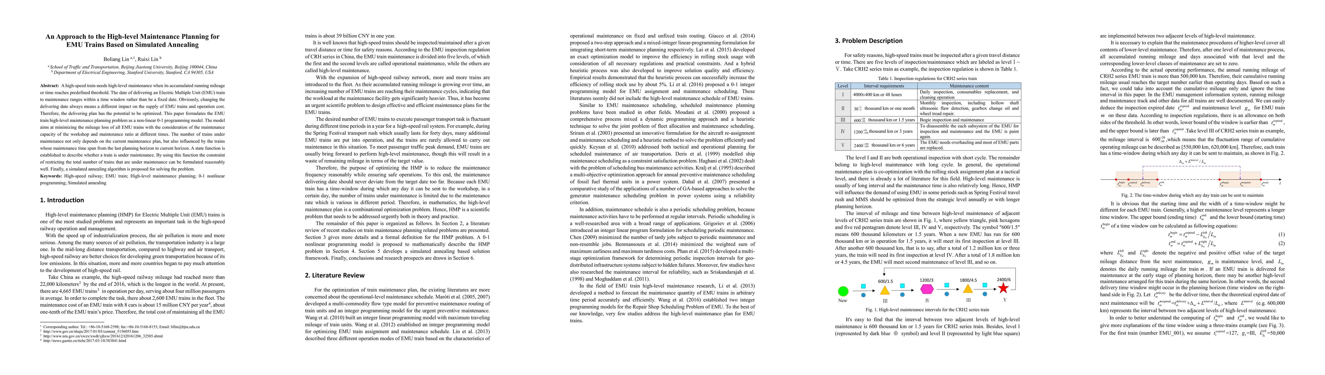 A high-speed train needs high-level maintenance when its accumulated running mileage or time reaches predefined threshold. The date of delivering an Electric Multiple Unit (EMU) train to maintenance ranges within a time window rather than be a fixed date. Obviously, changing the delivering date always means a different impact on the supply of EMU trains and operation cost. Therefore, the delivering plan has the potential to be optimized. This paper formulates the EMU train high-level maintenance planning problem as a non-linear 0-1 programming model. The model aims at minimizing the mileage loss of all EMU trains with the consideration of the maintenance capacity of the workshop and maintenance ratio at different times. The number of trains under maintenance not only depends on the current maintenance plan, but also influenced by the trains whose maintenance time span from the last planning horizon to current horizon. A state function is established to describe whether a train is under maintenance. By using this function the constraint of restricting the total number of trains that are under maintenance can be formulated reasonably well. Finally, a simulated annealing algorithm is proposed for solving the problem.
