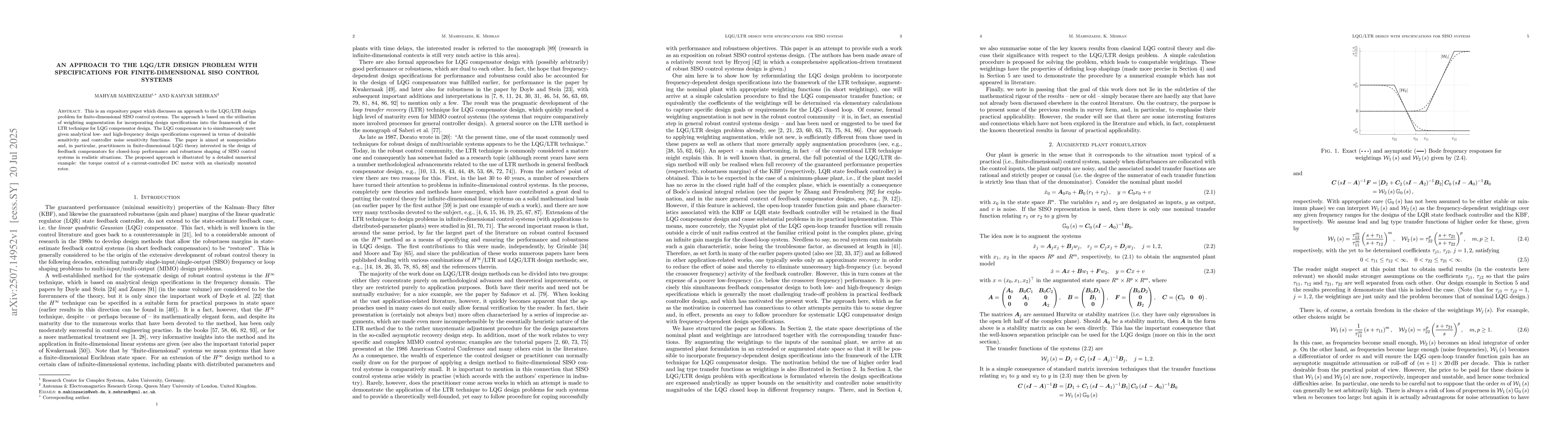 This is an expository paper which discusses an approach to the LQG/LTR design problem for finite-dimensional SISO control systems. The approach is based on the utilisation of weighting augmentation for incorporating design specifications into the framework of the LTR technique for LQG compensator design. The LQG compensator is to simultaneously meet given analytical low- and high-frequency design specifications expressed in terms of desirable sensitivity and controller noise sensitivity functions. The paper is aimed at nonspecialists and, in particular, practitioners in finite-dimensional LQG theory interested in the design of feedback compensators for closed-loop performance and robustness shaping of SISO control systems in realistic situations. The proposed approach is illustrated by a detailed numerical example: the torque control of a current-controlled DC motor with an elastically mounted rotor.