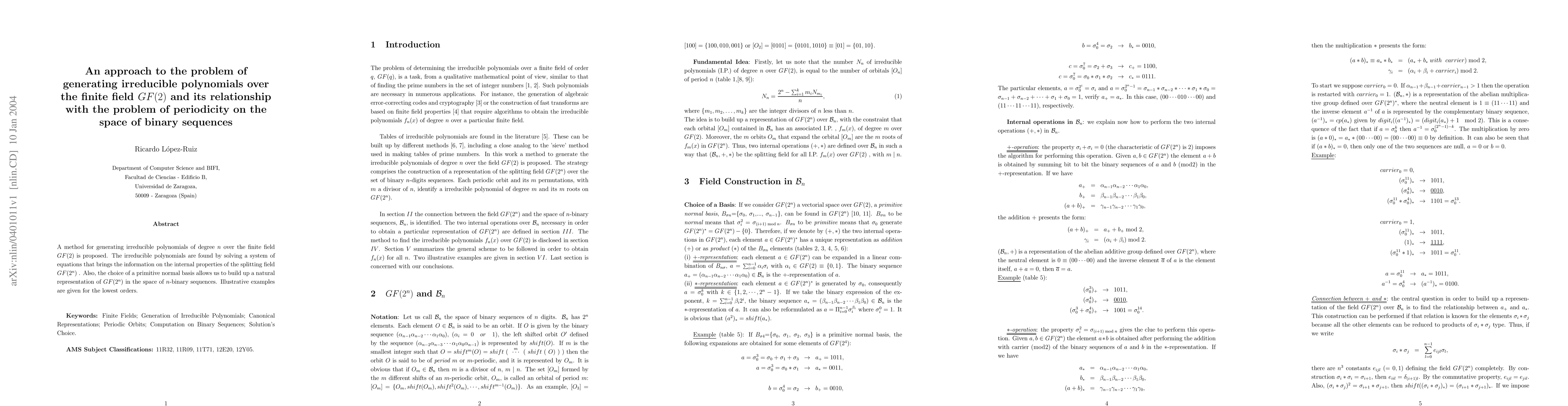 A method for generating irreducible polynomials over GF(2) is proposed, leveraging a system of equations to find internal properties of the splitting field GF(2^n). The approach also establishes a natural representation of GF(2^n) in n-binary sequences.