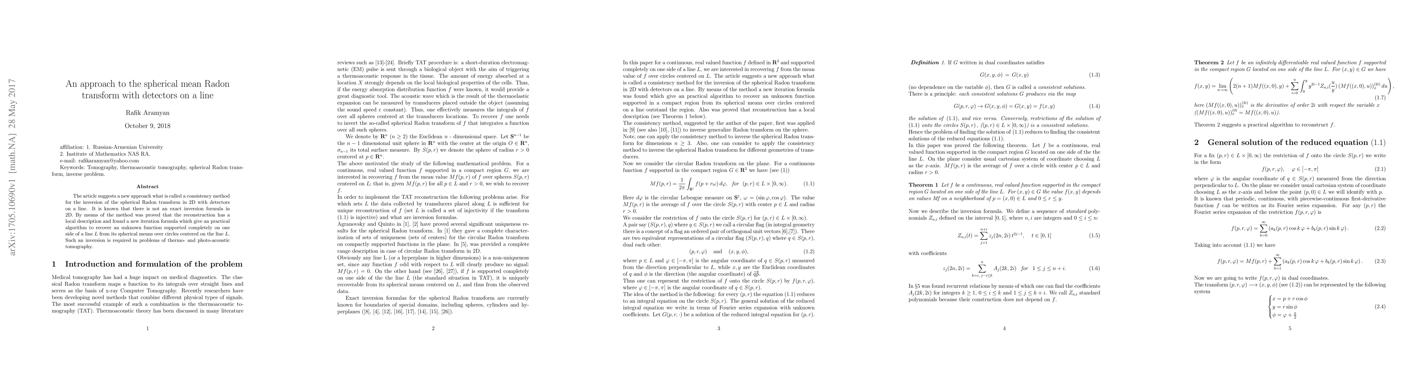 The article suggests a new approach what is called a consistency method for the inversion of the spherical Radon transform in 2D with detectors on a line. It is known that there is not an exact inversion formula in 2D. By means of the method was proved that the reconstruction has a local description and found a new iteration formula which give an practical algorithm to recover an unknown function supported completely on one side of a line $L$ from its spherical means over circles centered on the line $L$. Such an inversion is required in problems of thermo- and photo-acoustic tomography.