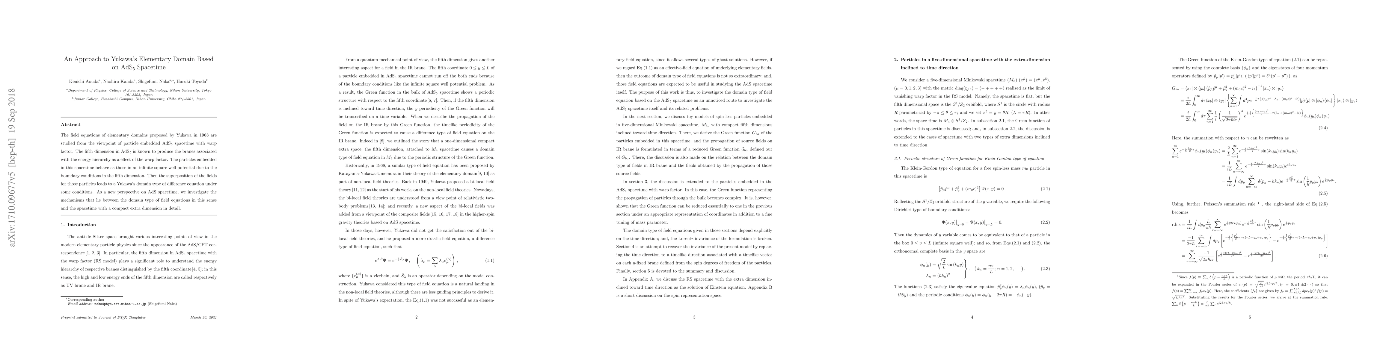 The field equations of elementary domains proposed by Yukawa in 1968 are studied from the viewpoint of particle embedded $\mbox{AdS}_5$ spacetime with warp factor. The fifth dimension in $\mbox{AdS}_5$ is known to produce the branes associated with the energy hierarchy as a effect of the warp factor. The particles embedded in this spacetime behave as those in an infinite square well potential due to the boundary conditions in the fifth dimension. Then the superposition of the fields for those particles leads to a Yukawa's domain type of difference equation under some conditions. As a new perspective on AdS spacetime, we investigate the mechanisms that lie between the domain type of field equations in this sense and the spacetime with a compact extra dimension in detail.