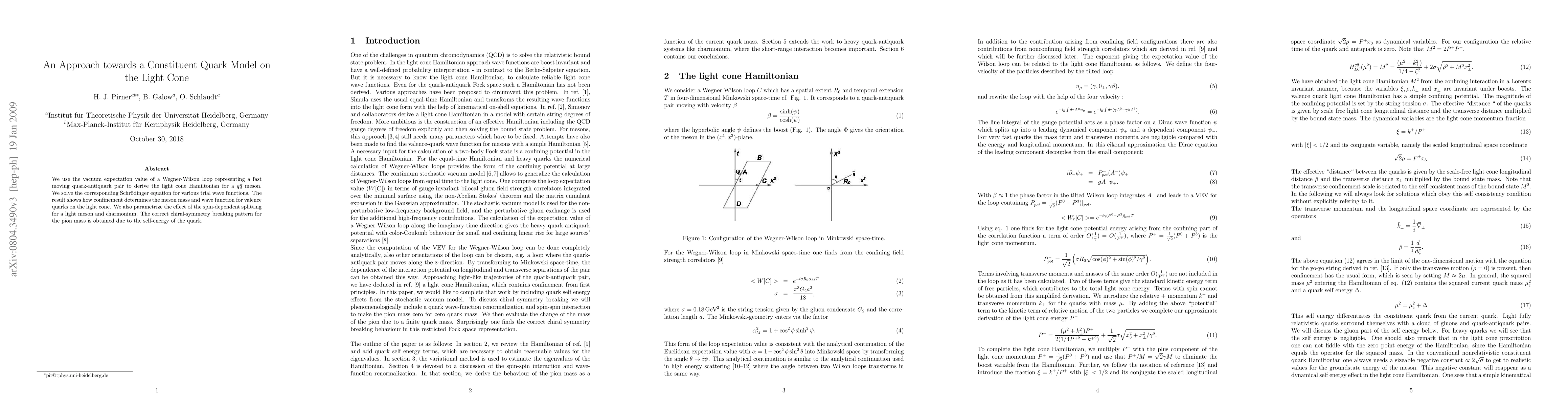 We use the vacuum expectation value of a Wegner-Wilson loop representing a fast moving quark-antiquark pair to derive the light cone Hamiltonian for a $q\bar q$ meson. We solve the corresponding Schr\"odinger equation for various trial wave functions. The result shows how confinement determines the meson mass and wave function for valence quarks on the light cone. We also parametrize the effect of the spin-dependent splitting for a light meson and charmonium. The correct chiral-symmetry breaking pattern for the pion mass is obtained due to the self-energy of the quark.