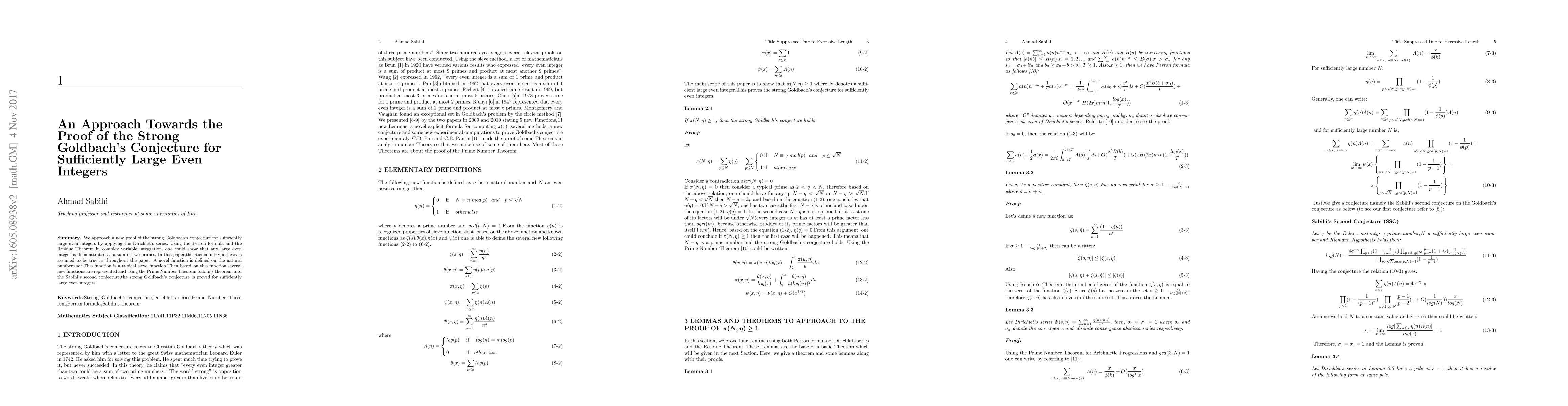 We approach a new proof of the strong Goldbach's conjecture for sufficiently large even integers by applying the Dirichlet's series. Using the Perron formula and the Residue Theorem in complex variable integration, one could show that any large even integer is demonstrated as a sum of two primes. In this paper,the Riemann Hypothesis is assumed to be true in throughout the paper. A novel function is defined on the natural numbers set.This function is a typical sieve function.Then based on this function,several new functions are represented and using the Prime Number Theorem,Sabihi's theorem, and the Sabihi's second conjecture,the strong Goldbach's conjecture is proved for sufficiently large even integers.