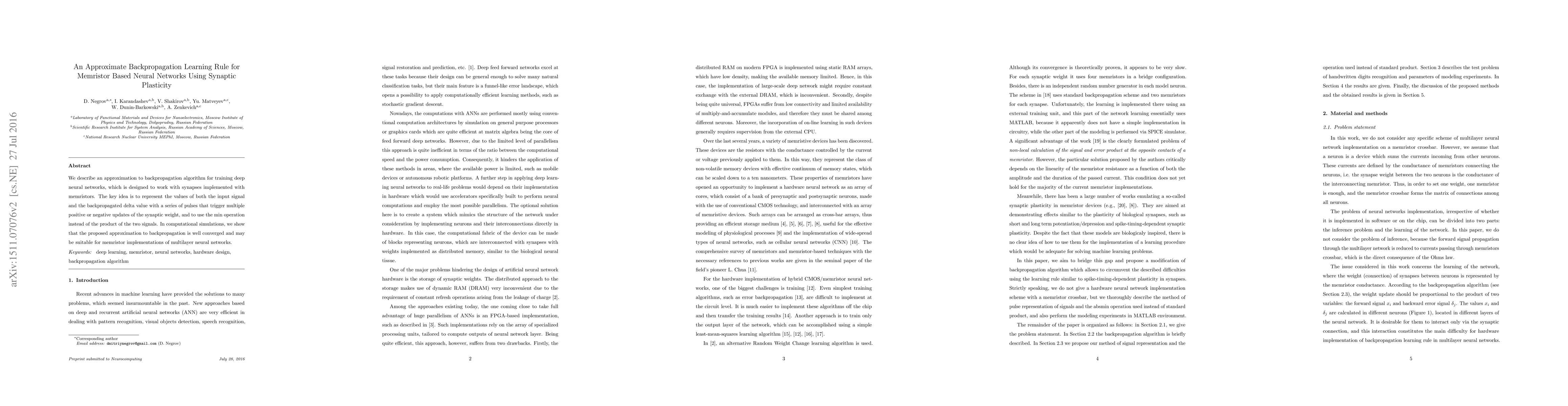 This paper proposes an approximate backpropagation learning rule for training neural networks with memristor-based synapses, utilizing pulse-based updates and the min operation instead of the traditional product, demonstrating good convergence in simulations for memristor implementations.