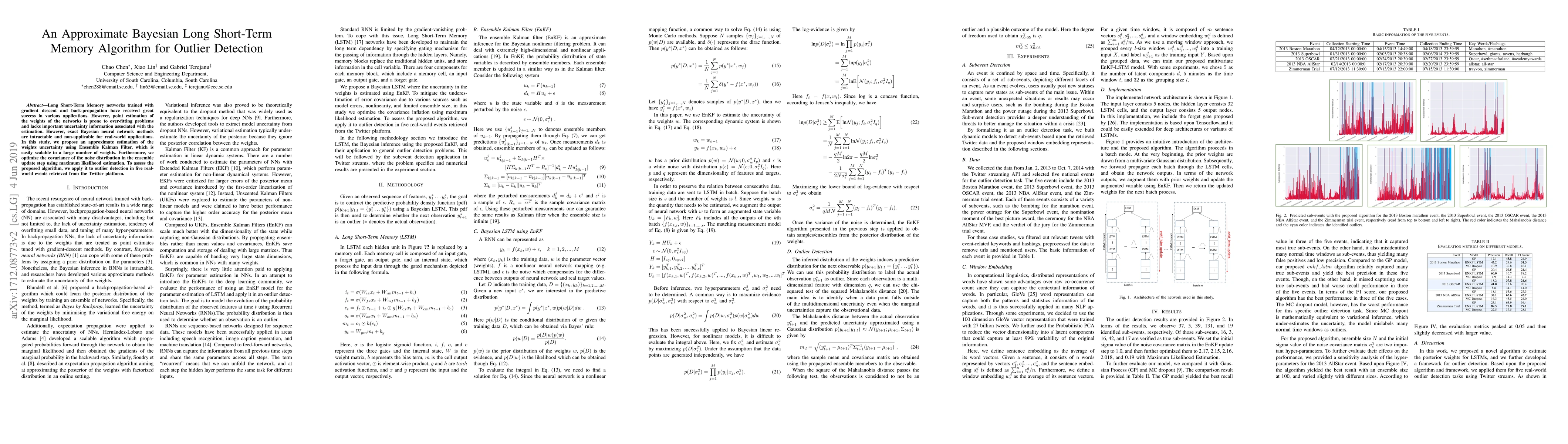 Long Short-Term Memory networks trained with gradient descent and back-propagation have received great success in various applications. However, point estimation of the weights of the networks is prone to over-fitting problems and lacks important uncertainty information associated with the estimation. However, exact Bayesian neural network methods are intractable and non-applicable for real-world applications. In this study, we propose an approximate estimation of the weights uncertainty using Ensemble Kalman Filter, which is easily scalable to a large number of weights. Furthermore, we optimize the covariance of the noise distribution in the ensemble update step using maximum likelihood estimation. To assess the proposed algorithm, we apply it to outlier detection in five real-world events retrieved from the Twitter platform.