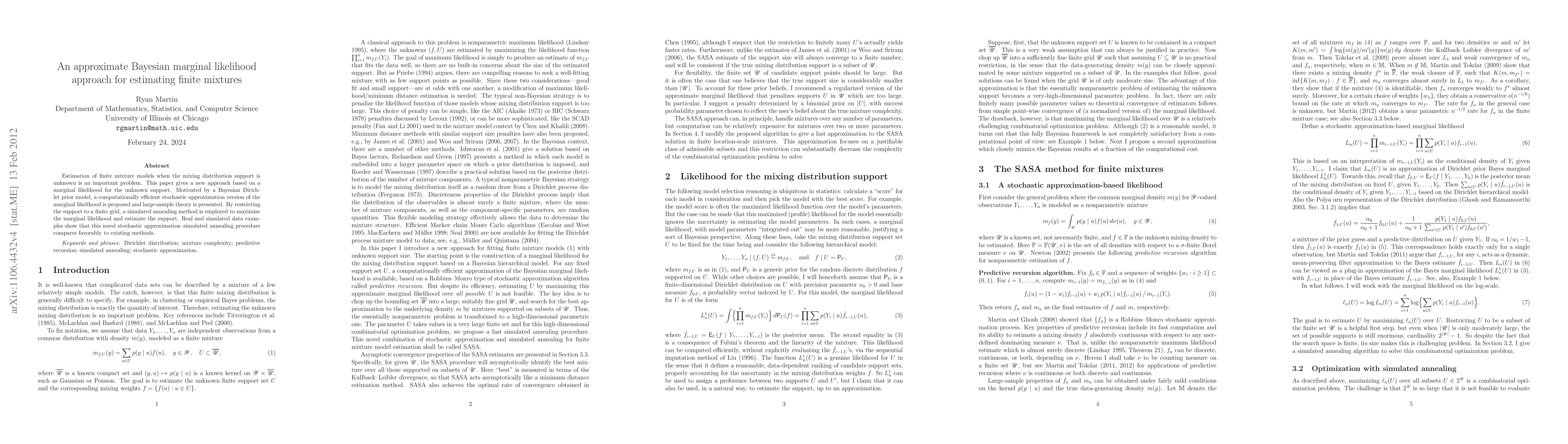 This paper proposes a new Bayesian approach for estimating finite mixtures with unknown support using a stochastic approximation of the marginal likelihood. The method employs simulated annealing to maximize the likelihood and estimate the support, demonstrating favorable performance compared to existing techniques through real and simulated data examples.