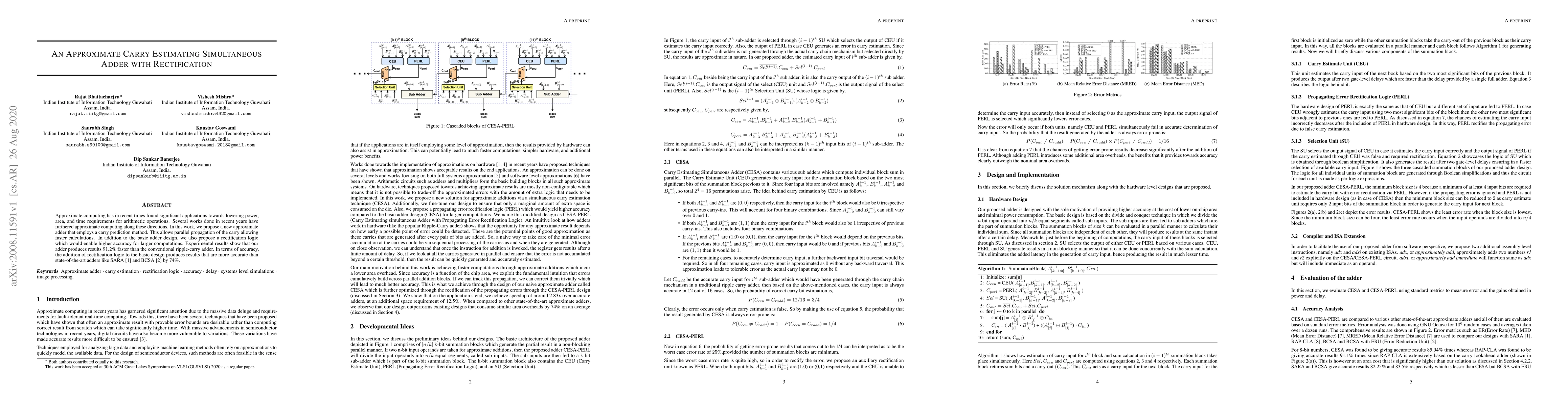 A novel approximate carry lookahead adder (CESA) is proposed, which combines early accurate carry estimation with a carry estimator circuit.