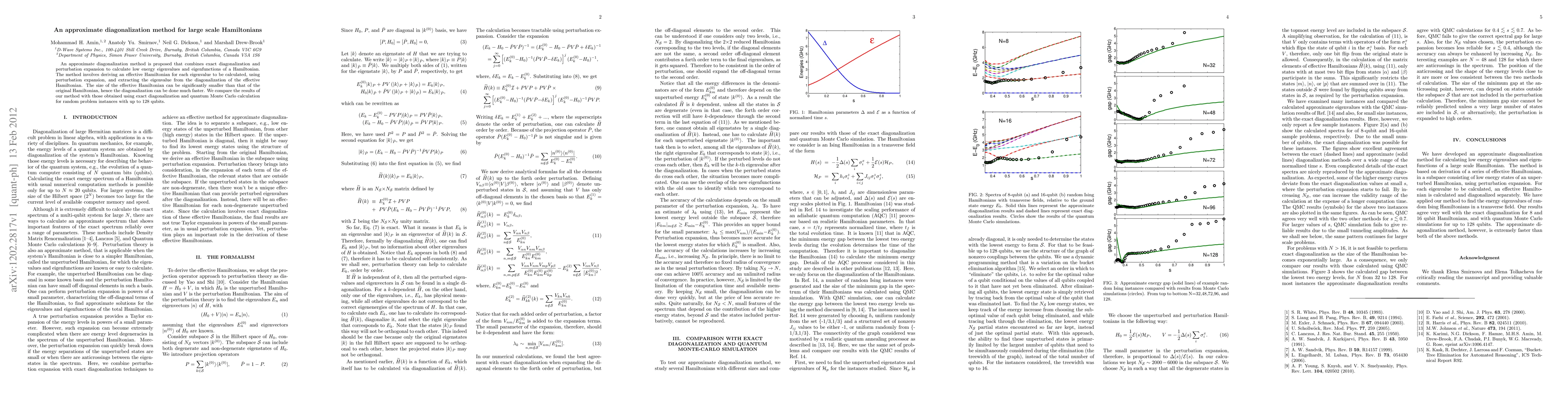 This paper proposes an approximate diagonalization method that combines exact diagonalization with perturbation expansion to efficiently compute low energy eigenvalues and eigenfunctions of large-scale Hamiltonians. The method derives smaller effective Hamiltonians for faster diagonalization and compares its results with exact diagonalization and quantum Monte Carlo for random 128-qubit problems.