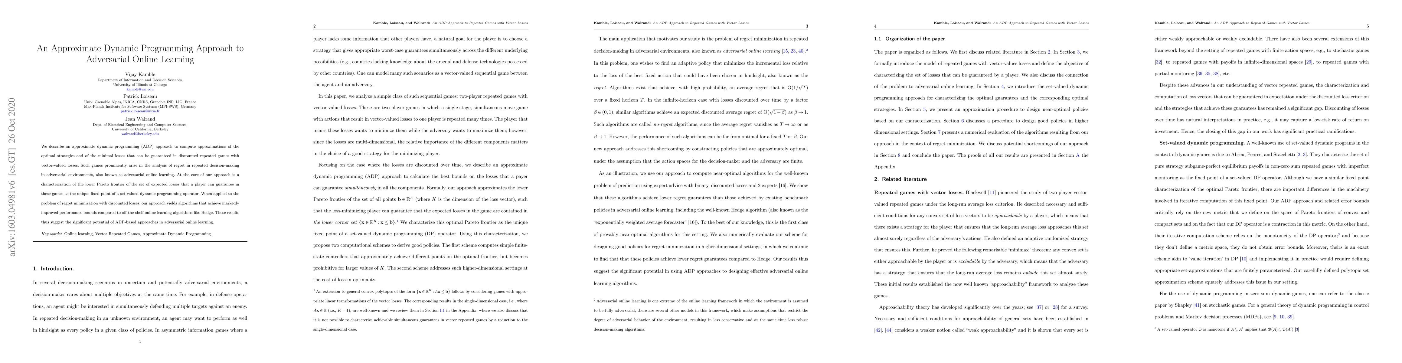 This paper proposes an approximate dynamic programming approach for adversarial online learning, focusing on computing optimal strategies and minimal losses in discounted repeated games. The method characterizes the lower Pareto frontier as a fixed point, leading to improved performance bounds over existing algorithms like Hedge.