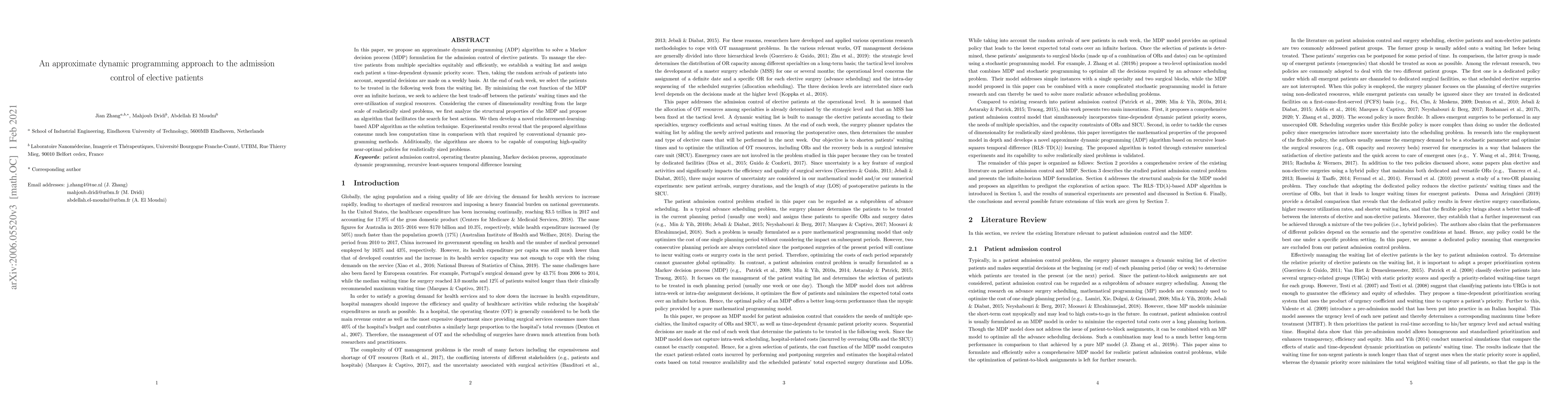 In this paper, we propose an approximate dynamic programming (ADP) algorithm to solve a Markov decision process (MDP) formulation for the admission control of elective patients. To manage the elective patients from multiple specialties equitably and efficiently, we establish a waiting list and assign each patient a time-dependent dynamic priority score. Then, taking the random arrivals of patients into account, sequential decisions are made on a weekly basis. At the end of each week, we select the patients to be treated in the following week from the waiting list. By minimizing the cost function of the MDP over an infinite horizon, we seek to achieve the best trade-off between the patients' waiting times and the over-utilization of surgical resources. Considering the curses of dimensionality resulting from the large scale of realistically sized problems, we first analyze the structural properties of the MDP and propose an algorithm that facilitates the search for best actions. We then develop a novel reinforcement-learning-based ADP algorithm as the solution technique. Experimental results reveal that the proposed algorithms consume much less computation time in comparison with that required by conventional dynamic programming methods. Additionally, the algorithms are shown to be capable of computing high-quality near-optimal policies for realistically sized problems.