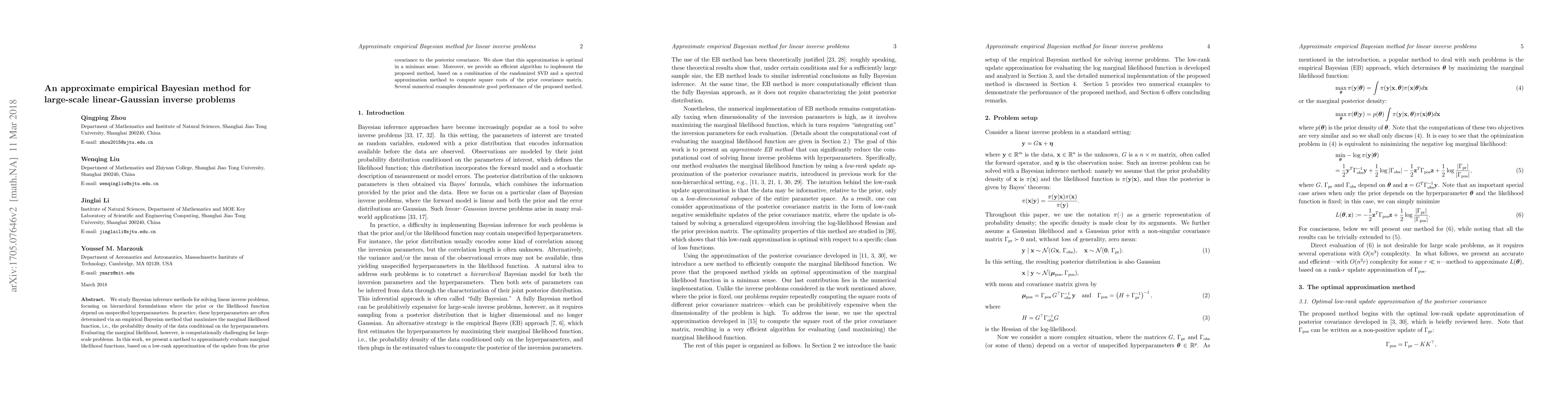This paper presents an approximate empirical Bayesian method for solving large-scale linear-Gaussian inverse problems by efficiently evaluating marginal likelihood functions using a low-rank approximation. The method combines randomized SVD and spectral approximation to handle computational challenges, demonstrating effective performance through numerical examples.