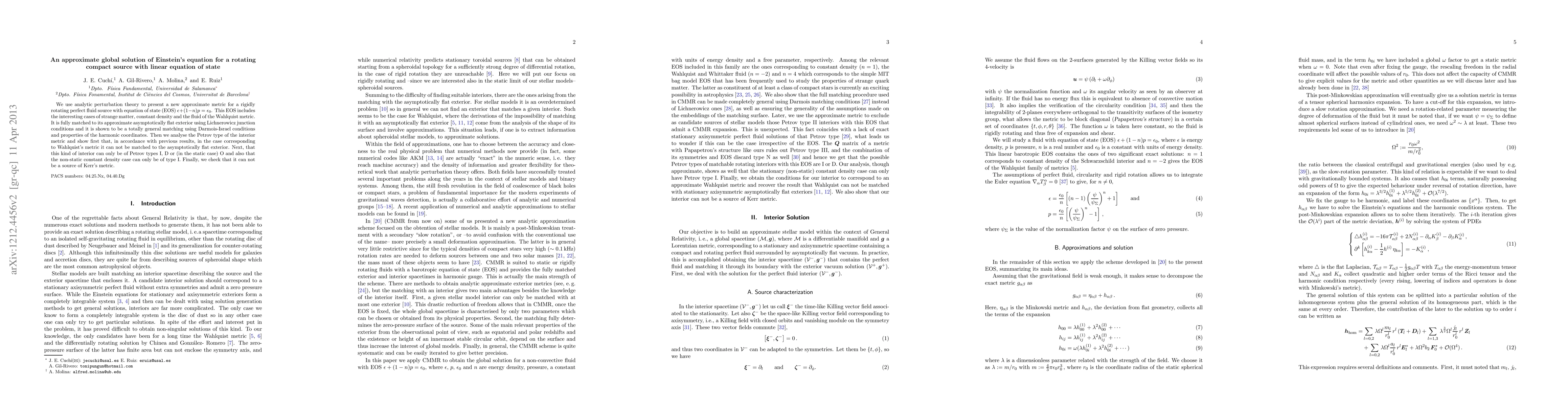 We use analytic perturbation theory to present a new approximate metric for a rigidly rotating perfect fluid source with equation of state (EOS) $\epsilon+(1-n)p=\epsilon_0$. This EOS includes the interesting cases of strange matter, constant density and the fluid of the Wahlquist metric. It is fully matched to its approximate asymptotically flat exterior using Lichnerowicz junction conditions and it is shown to be a totally general matching using Darmois-Israel conditions and properties of the harmonic coordinates. Then we analyse the Petrov type of the interior metric and show first that, in accordance with previous results, in the case corresponding to Wahlquist's metric it can not be matched to the asymptotically flat exterior. Next, that this kind of interior can only be of Petrov types I, D or (in the static case) O and also that the non-static constant density case can only be of type I. Finally, we check that it can not be a source of Kerr's metric.